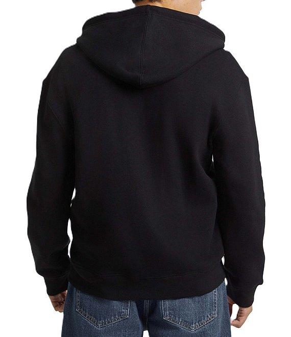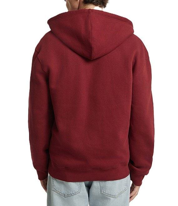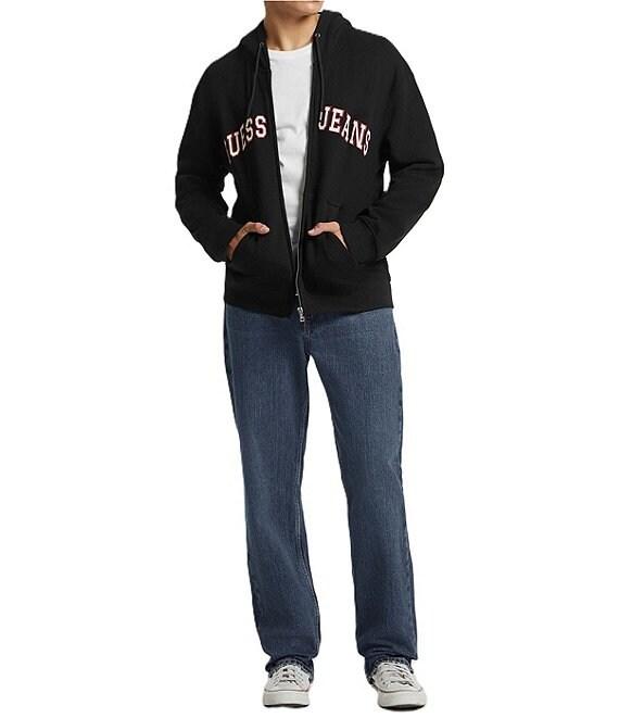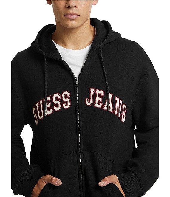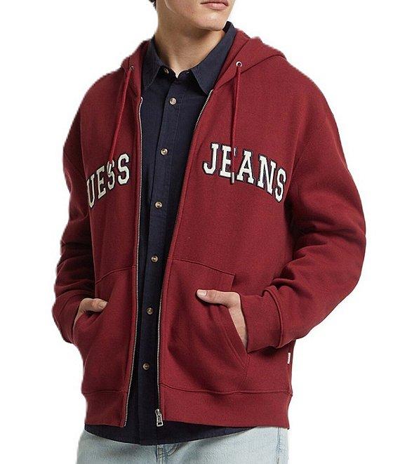 From Guess, this hoodie features: Knit fleece Regular fit Hood with drawstrings Long sleeves Zip-front closure Embroidered appliqué logo on the front Split kangaroo pocket Organic Cotton/recycled polyester Contains organic cotton fiber and recycled plastic Machine wash/tumble dry Imported.