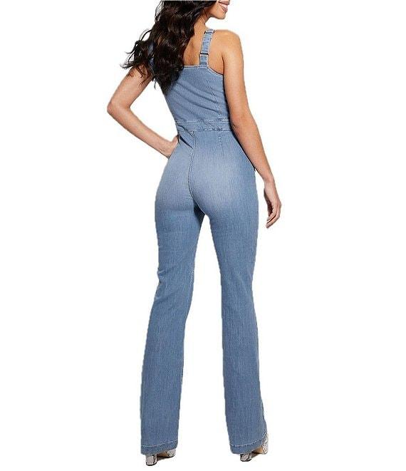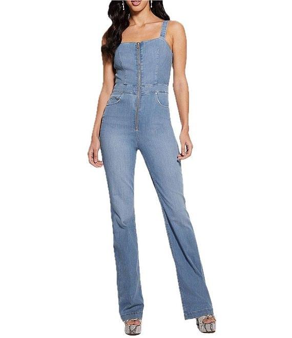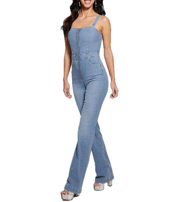 From Guess, this jumpsuit features: Square neckline Sleeveless Adjustable shoulder straps Zip-front closure Wide legs Cotton/Lyocell/polyester/elastane denim Hand wash/lay flat to dry Imported.