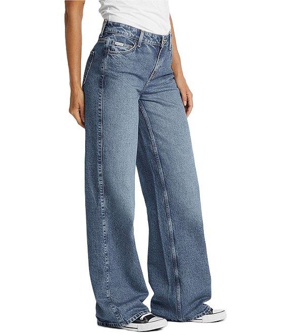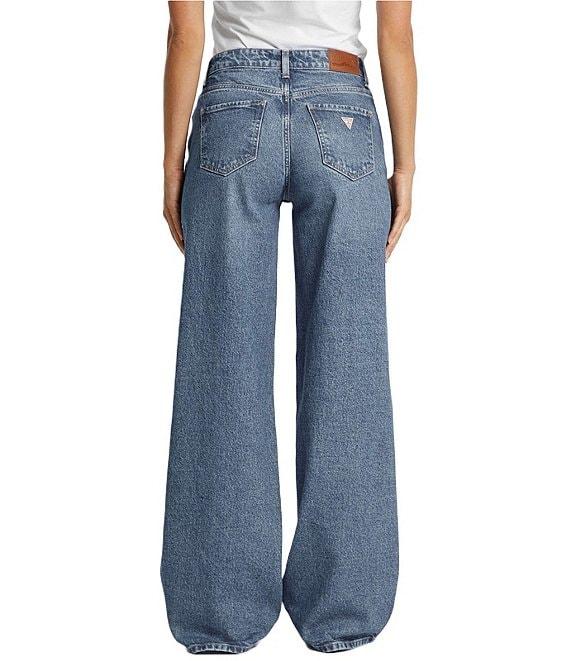 From Guess, these jeans feature: Mid rise Front button/zip fly closure 5-pocket styling Wide legs Approx. 30", 32" inseams Cotton/spandex Machine wash/tumble dry Imported.