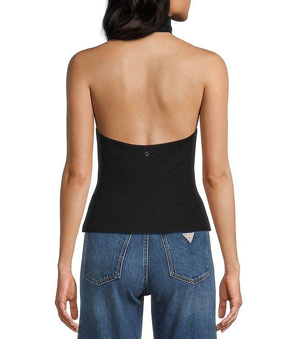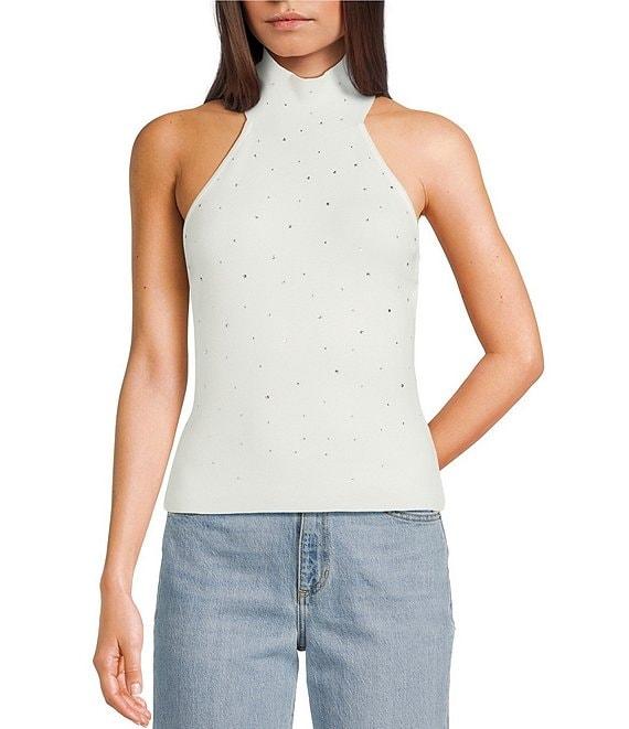 From Guess, this sweater features: Rhinestone detailing throughout Ribbed knit Halter mock neckline Sleeveless Open back Pullover styling ECOVERO™ viscose/polyamide/nylon Hand wash/line dry Imported.