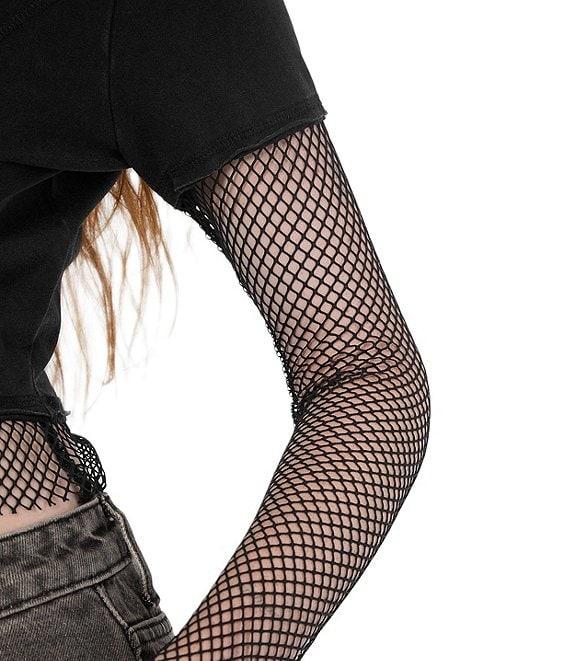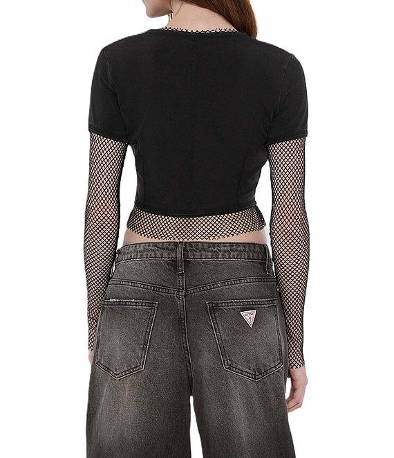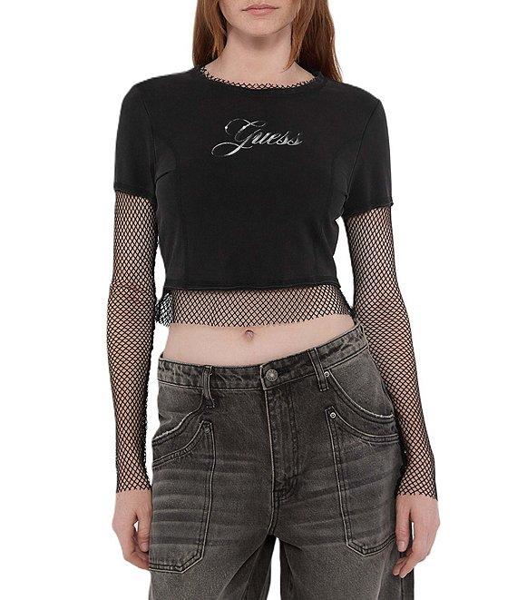 From Guess, this top features: Knit jersey with fishnet trim Slim fit and cropped length Scoop neckline Fishnet long sleeves with layered short sleeves Script logo graphic on the front Pullover styling Cotton, elastane/spandex Machine wash/tumble dry Imported.