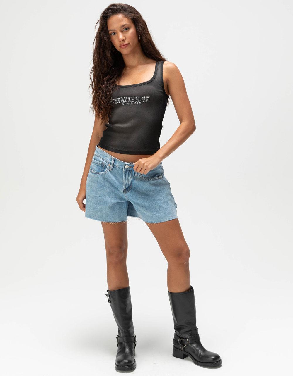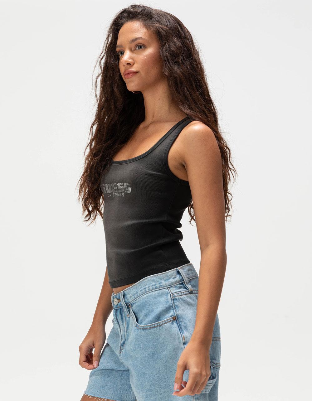 BLACK. Guess Originals Washed Rhinestone Tank Top. This tank top has a unique wash to it that gives a faded coloration on the front and back. If you need a little bling in your life this tank is the one for you. Guess Originals branding on the front with a star will have you sparkling. 93% Cotton, 7% Spandex. Hand wash. Imported.