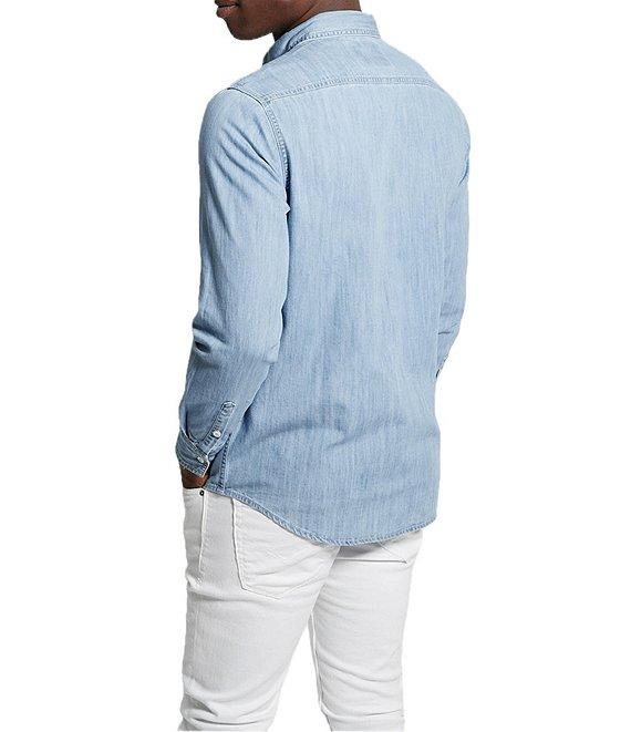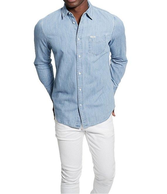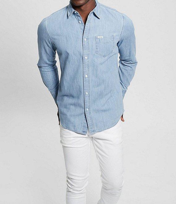 From Guess, this shirt features: Woven fabrication Point collar Long sleeves Button-front closure Shirttail hem Cotton Hand wash Imported