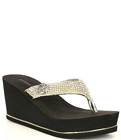 Find a new daily go-to with the Guess Sarraly wedges. Heeled sandals feature a metallic, synthetic upper with signature log hardware. Slip-on wear with single toe post. Fixed EVA footbed. Wedge heel and platform with metallic detailing. Synthetic outsole. Imported. Measurements: Heel Height: 3 in Weight: 6 oz Platform Height: 1 1 4 in Product measurements were taken using size 8, width M. Please note that measurements may vary by size.
