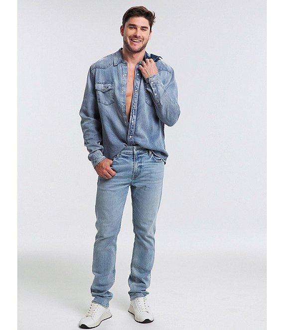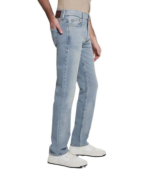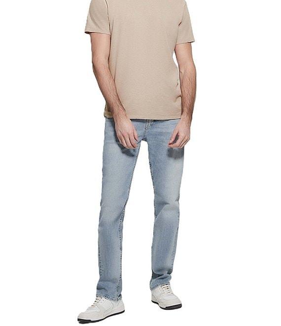 From Guess, these jeans feature: Slim fit Straight legs Flat-front styling 2 front pockets (1 with coin pocket) 2 back pockets Zippered fly with button closure Belt loops 7.5" leg openings 30"-32" inseam Cotton/polyester Machine wash/tumble dry Imported.