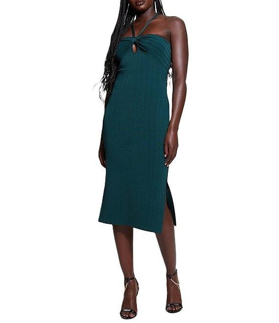 From Guess, this dress features: Rib-knit fabrication Halter neckline Sleeveless Front keyhole cut-out Side slit Side zip closure Rayon (viscose)/polyester/spandex Hand wash Imported.