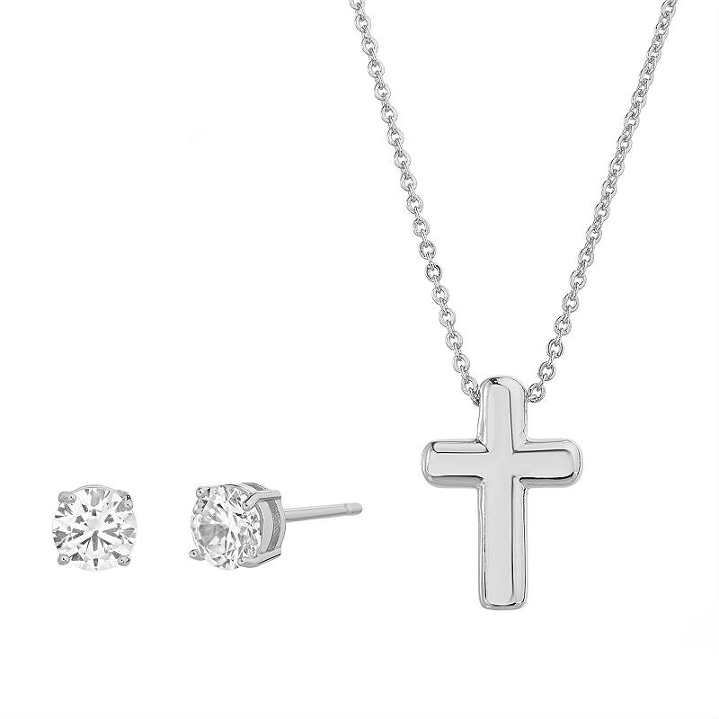 Embrace timeless faith with this Guided by Faith Silver Tone Puffy Cross Necklace & Cubic Zirconia Stud Earring Set. The classic silver-tone finish and radiant cubic zirconia accents create an elegant look. Click on this JEWELRY & WATCHES GUIDE to learn about fit, styles, materials and more! Embrace timeless faith with this Guided by Faith Silver Tone Puffy Cross Necklace & Cubic Zirconia Stud Earring Set. The classic silver-tone finish and radiant cubic zirconia accents create an elegant look. Click on this JEWELRY & WATCHES GUIDE to learn about fit, styles, materials and more! FEATURES Includes: necklace & one pair of earrings Drop length: 0.5 in. Chain length: 18 in. + 2-in. extender Chain type: cable Clasp: lobster-claw Dimensions: 5 mm x 5 mm Backings: post Nickel free Metal: brass Plating: silver tone Finish: polished Packaging: boxedSTONE DETAILS Stone type: cubic zirconia Total weight: 9/10 ct. Shape: round Setting: prong Gemstones may have been treated to enhance their appearance. Special care may be required. Please visit our Gemstone Treatment & Special Care Guide for more information. Size: 18. Gender: female. Age Group: adult.