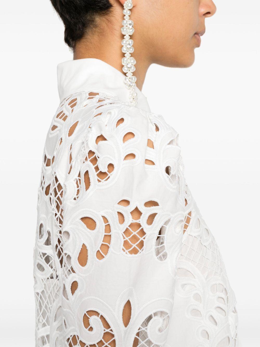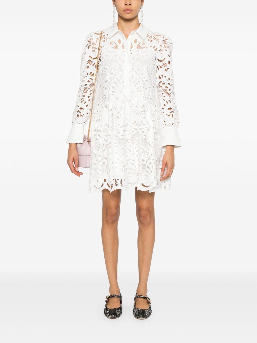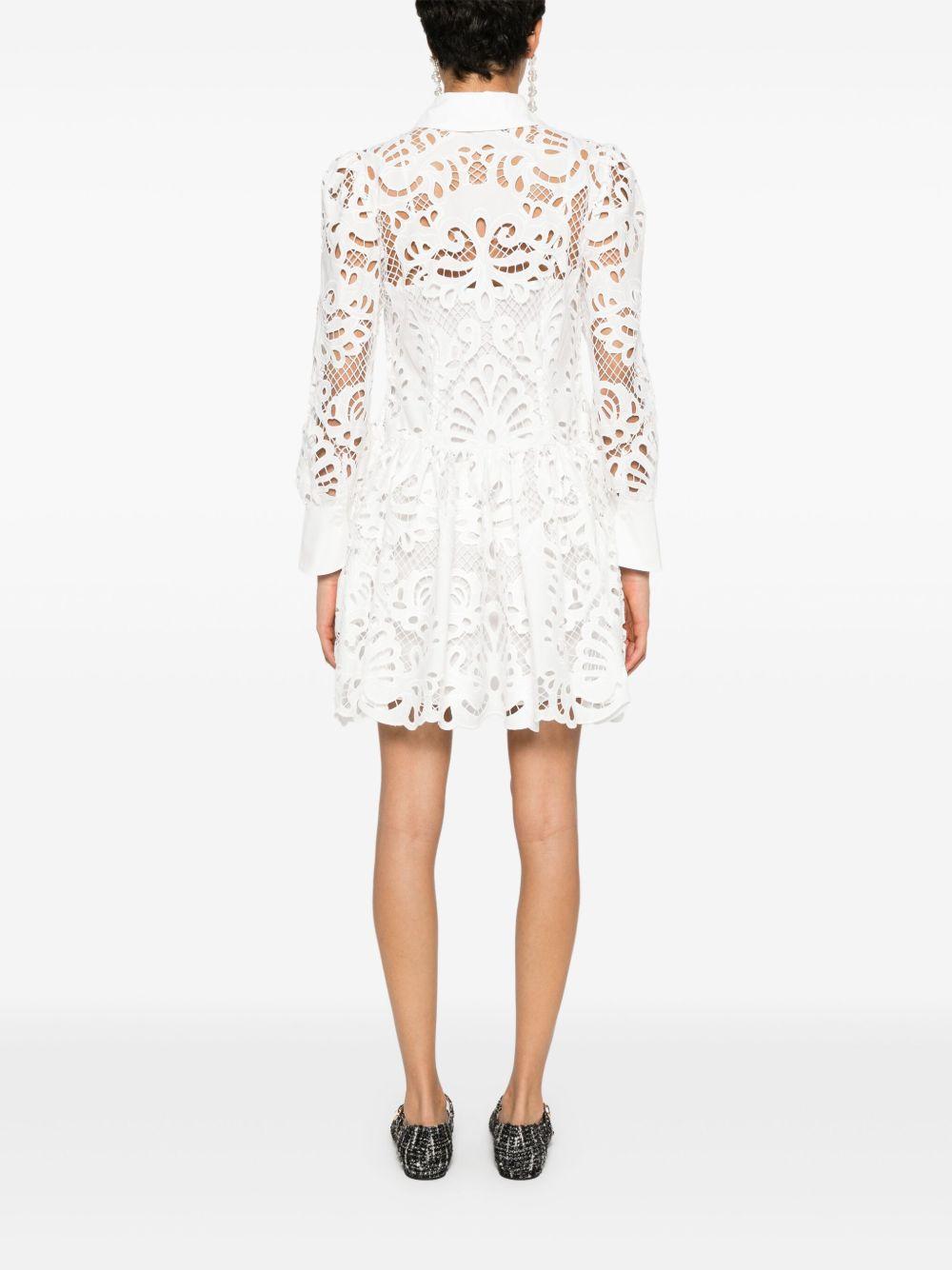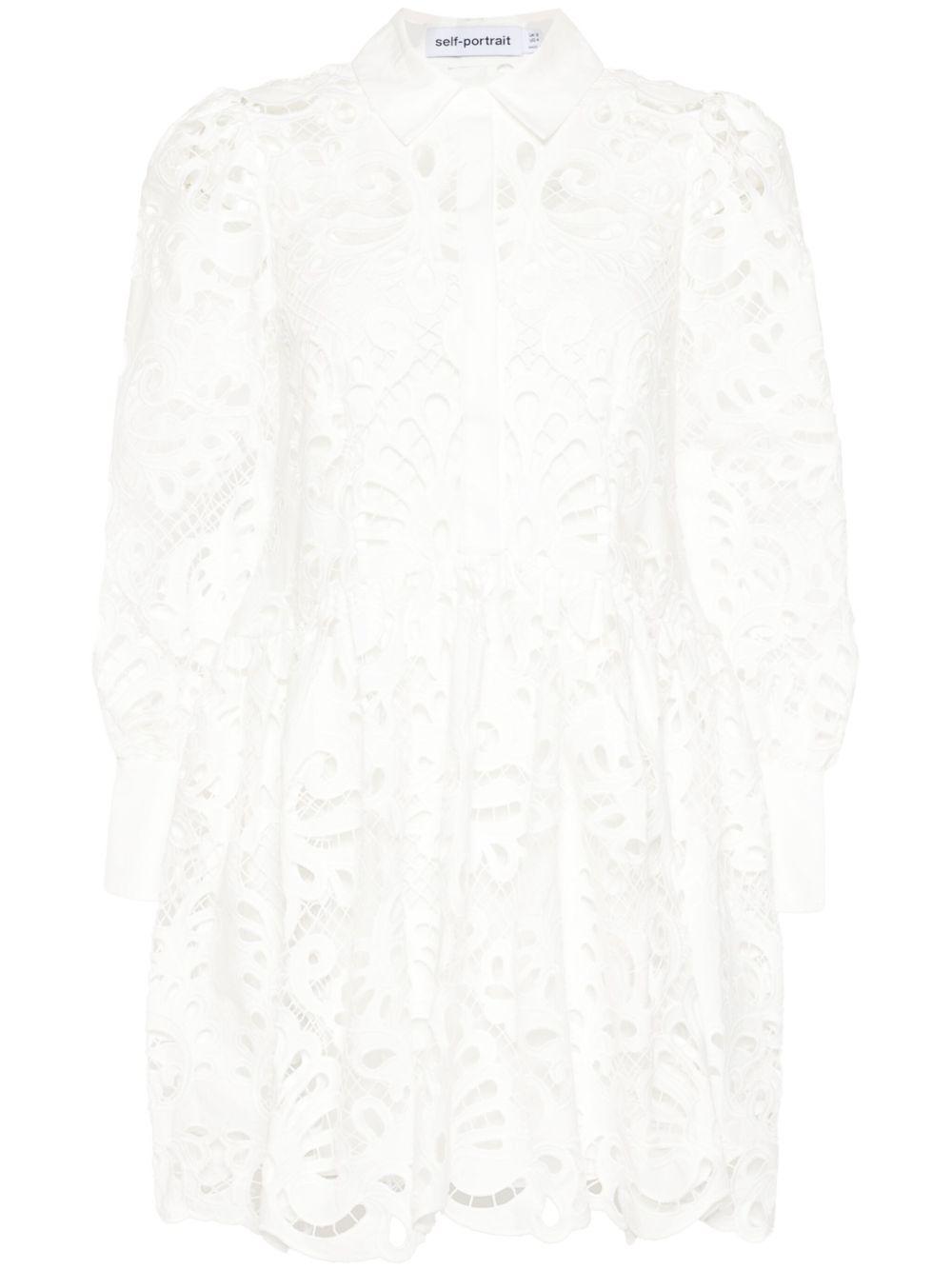 Self-Portrait guipure-lace mini dress | White | white | cotton | guipure lace | spread collar | long sleeves | buttoned cuffs | flared | pleat detailing | scallop hem | internal slip dress | concealed front button fastening | Polyester/Cotton/Cotton | Day Dresses | Dresses | Clothing | Women