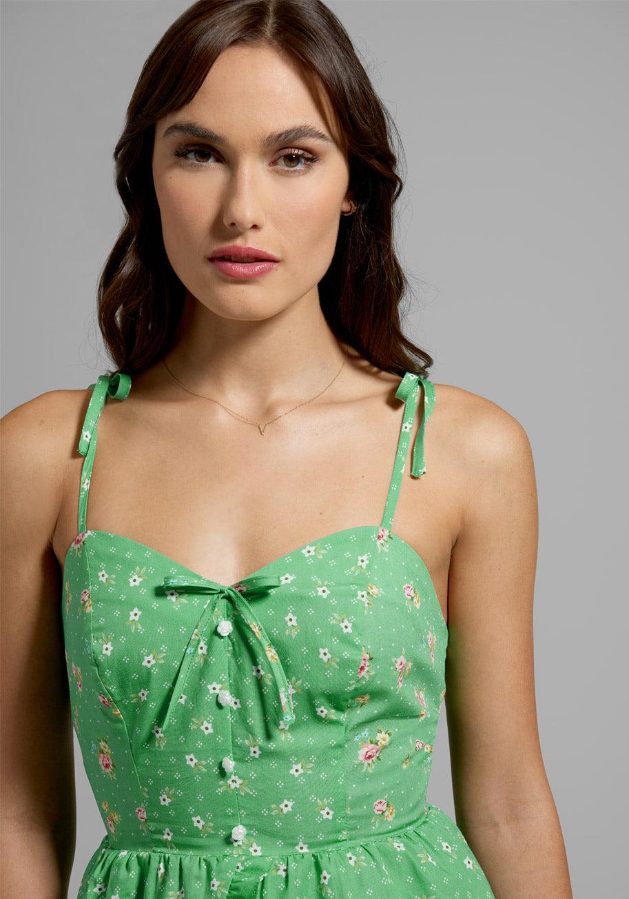 GUNNE SAX for ModCloth brings you this green peplum top, inspired by the romance and legacy of a true vintage icon. Made from a calico cotton weave and covered throughout in a dotted floral bouquet print inspired by the GUNNE SAX archives, this bare shoulder sleeveless top has adjustable fine tie-bow shoulder straps, a face framing sweetheart neckline adorned with a center tie-bow, decorative pearly rosette-shaped buttons down the front, and smocked side panels at the back bodice for ease-of-fit. The front bodice of this top features figure flattering contrast inserts from a ‘sister’ floral ditsy print, and a petal peplum hemline with a delicate ruffle trim finishes this alluring look. With this GUNNE SAX for ModCloth collaboration, ModCloth wishes to honor Jessica McClintock and her brand’s legacy for a whole new generation of people. 100% Cotton. Dry Clean (recommended). Fits true to size. Adjustable tie-bow shoulder straps. Smocked panels at back provides stretch. Fabric does not provide stretch. Decorative front buttons. Imported
