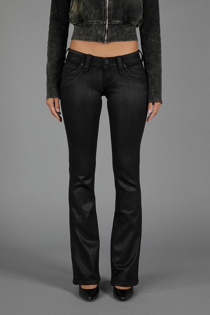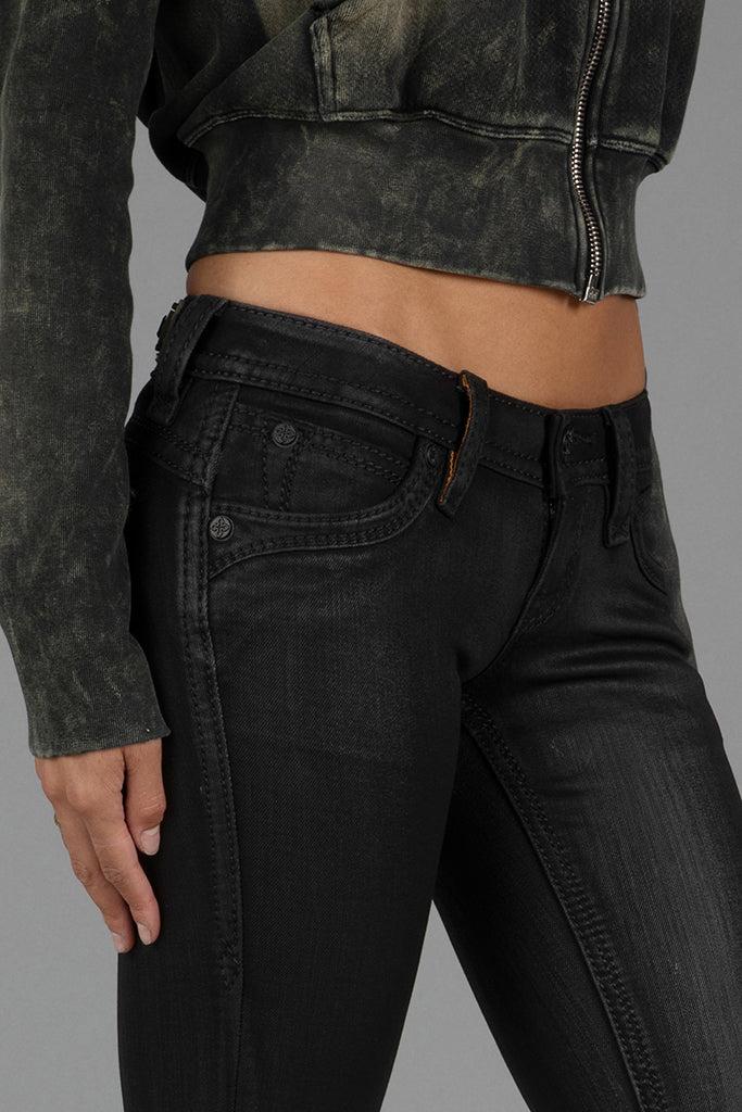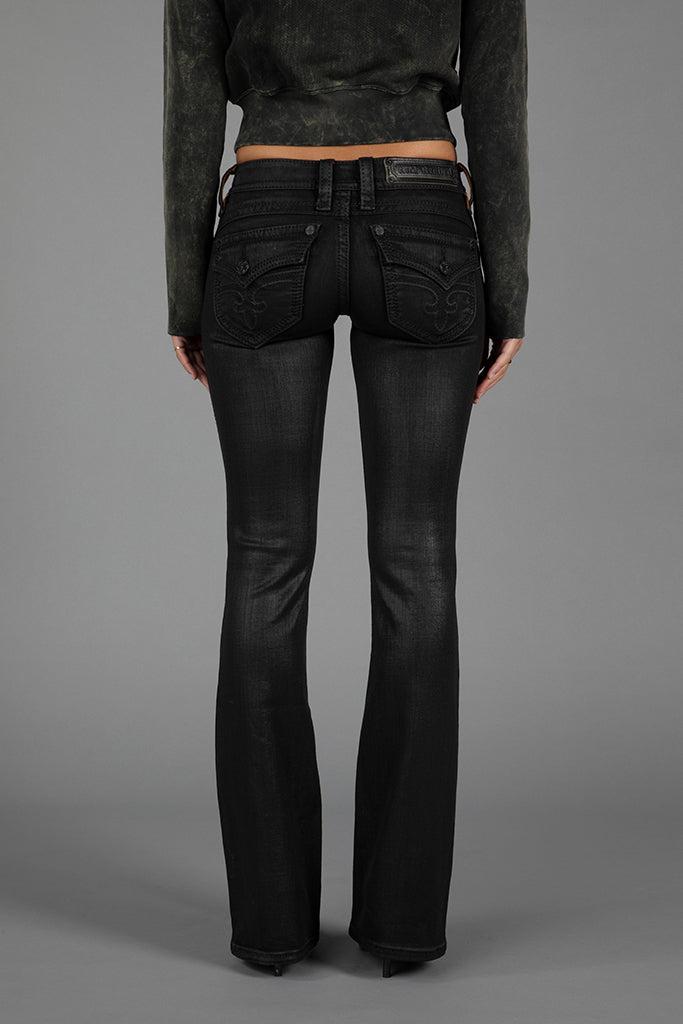 Gwen Super Low-Rise Bootcut Jeans by Rock Revival features a super low rise with a bootcut silhouette crafted in a black wash, designed in Los Angeles.