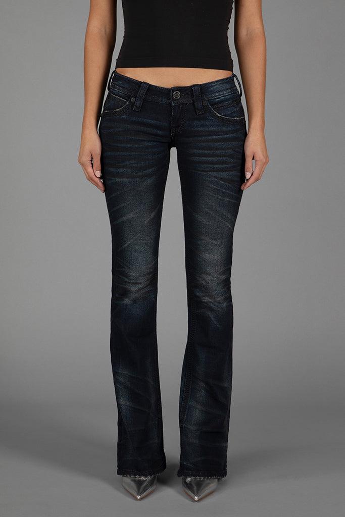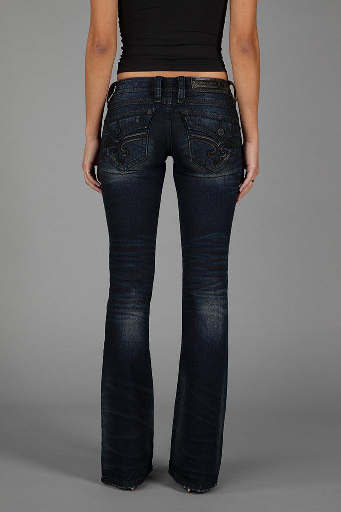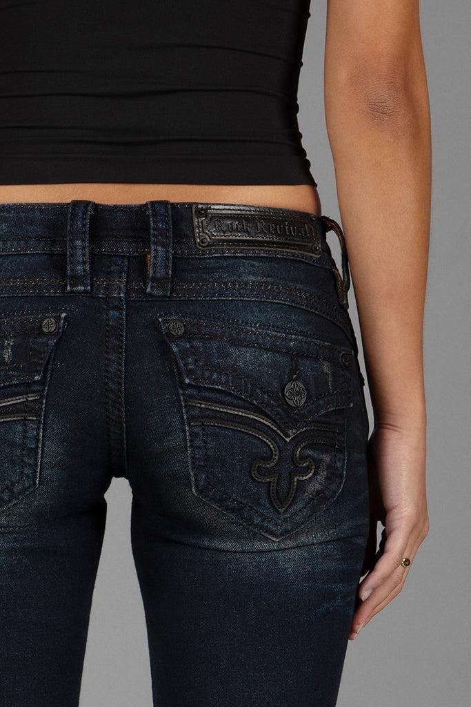 Gwen Super Low-Rise Bootcut Jeans by Rock Revival features a low rise with a bootcut silhouette crafted in a dark wash, designed in Los Angeles. Premium stretch denim for comfort and durability Signature inverted Fleur-de-Lis embroidery Custom pewter hardware and rivets Engraved 'Rock Revival' leather waist patch For a more relaxed fit, it is possible to size up