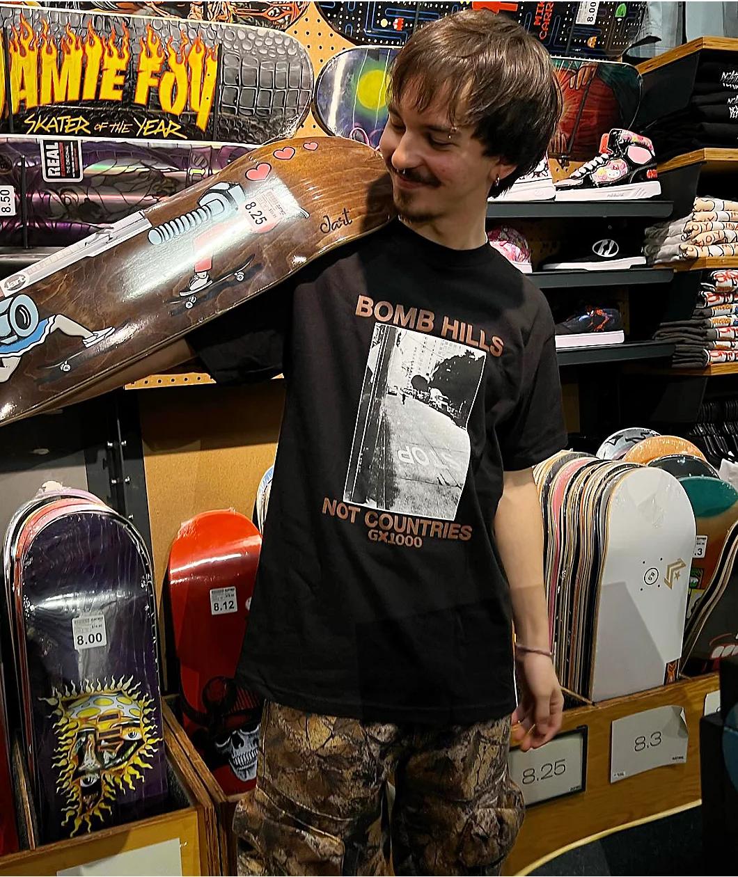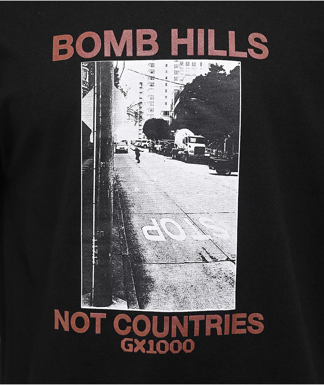Add an anti-war message to any outfit with the Bomb Hills t-shirt from GX1000. The black tee features text reading "Bomb Hills not countries" surrounding an image of a rider performing the titular skateboard trick on a downtown street. With a printed