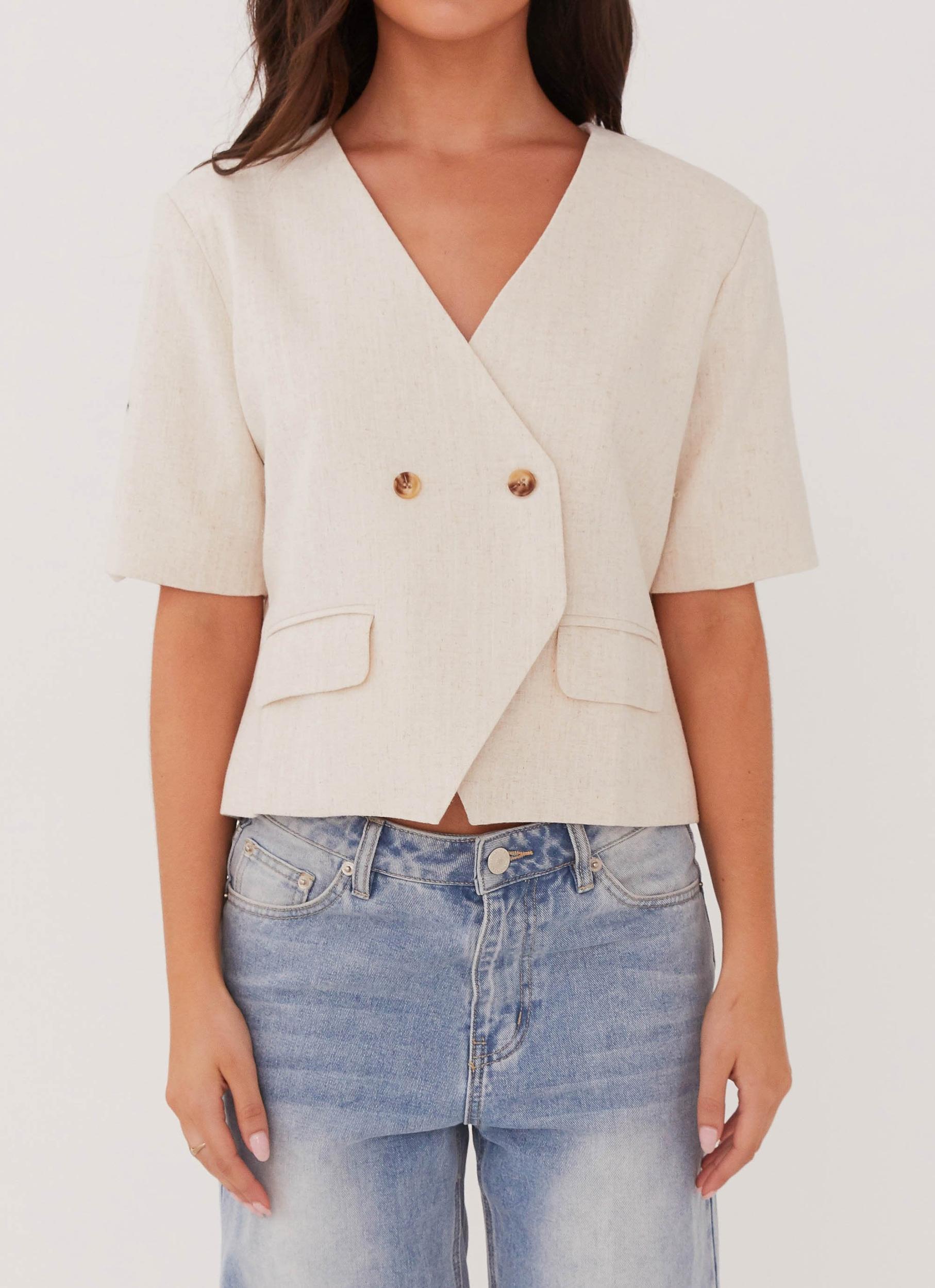 Peppermayo Exclusive Indulge in our Hacienda Linen Short Sleeve Blazer. Featuring a flattering oversized fit and sophisticated v-neckline, this blazer is adorned with stylish tortoise shell buttons for a touch of refinement. Effortlessly elevate your style and embrace the allure of golden skies, balmy nights, and the chic silhouette of nightlife. - Short sleeve shirt- Oversized fit- V-neckline- Dropped shoulder- Lined- Front buttons- Shoulder pads- Twin faux pockets- 45% Linen, 55% Cotton Size AU 8 / US 4 garment measurements: Waist 102cmLength 54cmBust 108cm Olivia wears size AU 8 / size US 4