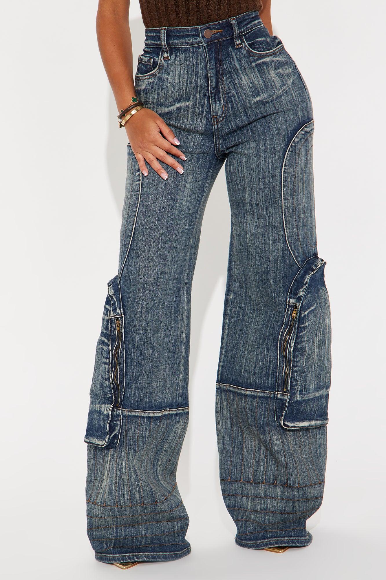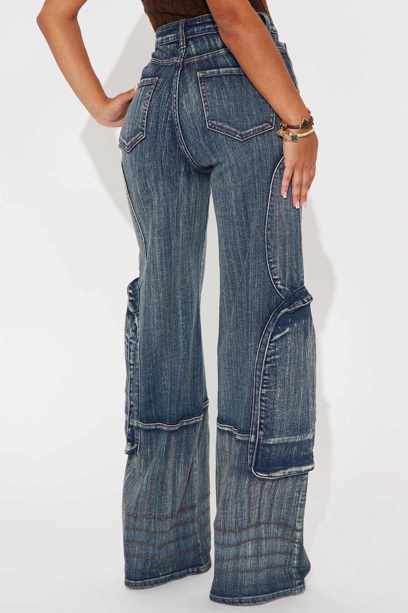Available In Grey And Medium Wash. Straight Leg Jeans Button & Zip Closure Front & Back Pockets Cargo Pockets Seaming High Stretch 12" Front Rise 35" Inseam Disclaimer: Due To The Specialized Wash Process, Each Garment Is Unique. 98% Cotton 2% Spandex Imported California Proposition 65WARNING: Cancer and Reproductive Harm - www.P65Warnings.ca.gov.