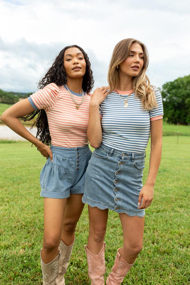 Details Gathered Short Sleeve Blue Stripe Knit Tee Ribbed fabric has stretch Crew neckline Puff short sleeve Color contrasting Unlined Material and Care 95% cotton 5% spandex Hand wash cold, no drum drying Size and Fit Size Small approximate measurements. Bust: 30" Length: 19.75" Form-fitting