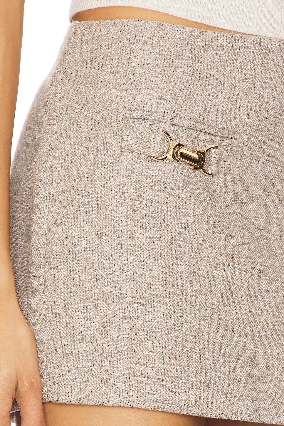 Self: 80% polyester, 20% woolLining: 95% polyester, 5% elastane. Made in China. Hand wash cold. Fully lined. Hidden back zip closure. Faux pocket styling. Gold-tone belted accents. Skirt measures approx 11.75" in length. Revolve Style No. MOTO-WQ100. Manufacturer Style No. MTQ127 S25.