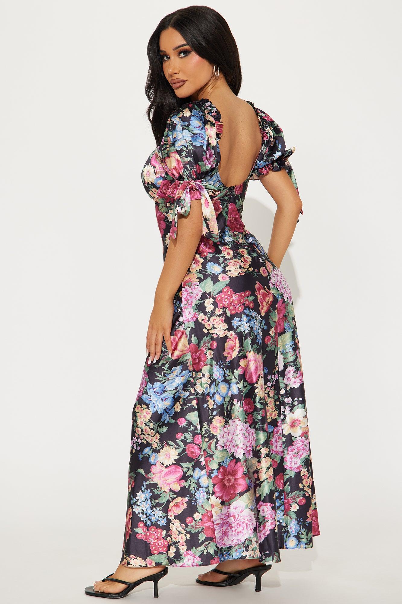 Available In Black/combo. Satin Floral Maxi Dress Short Puff Sleeves Bow Detail V_Neckline Flowy Silhouette Low Back Hidden Back Zipper Stretch Self : 100% Polyester Imported
