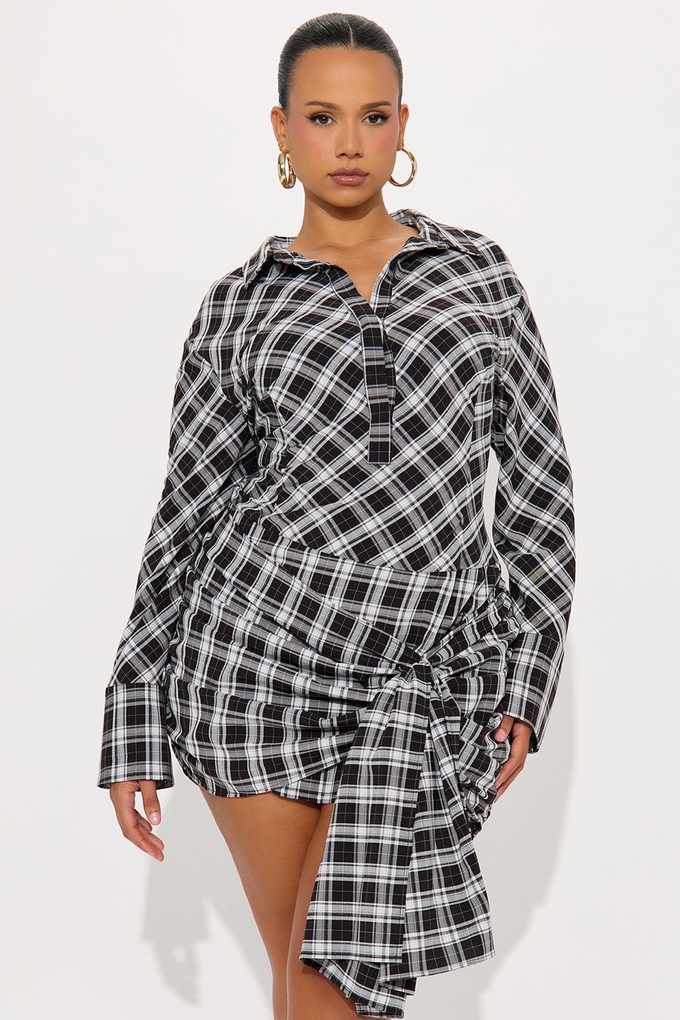 Available In Black/combo. Plaid Mini Dress Collar Long Sleeve Button Up Ruched Draped Side Zipper Length Measured Flat = 32" Self: 98% Polyester 2% Spandex Imported