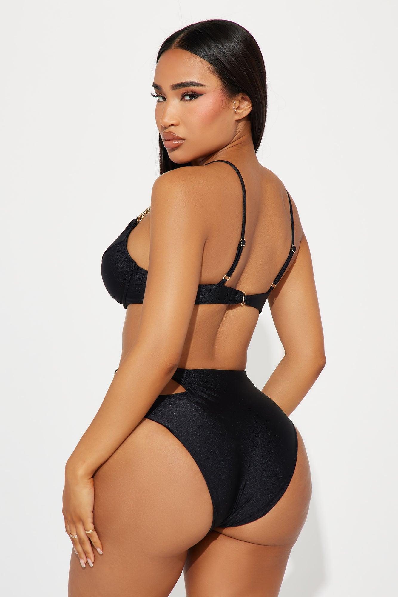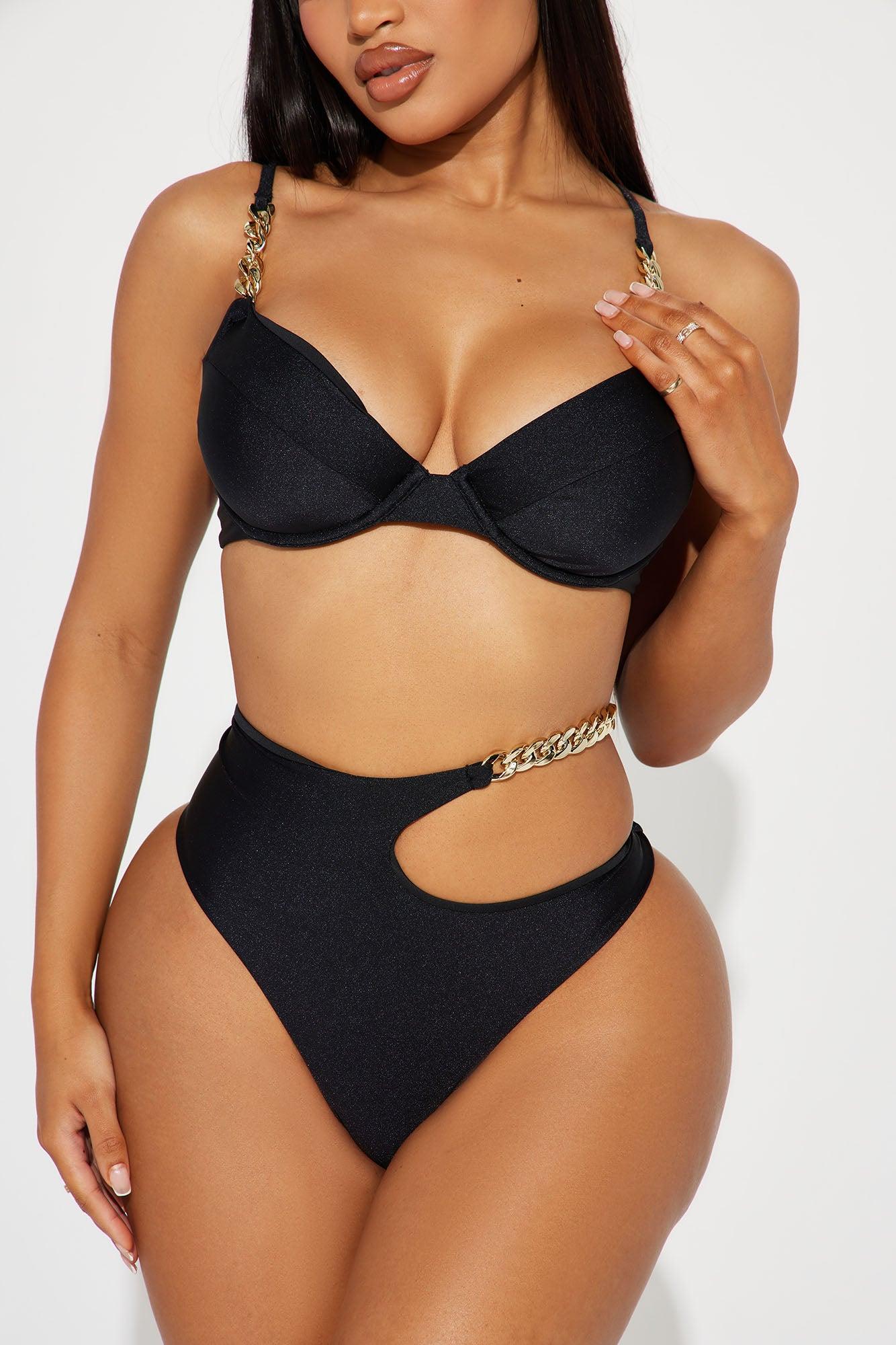 Available In Black. 2 Piece Ensemble Bikini Underwire Bikini Top Padded Adjustable Straps Hardware Back Closure Bikini Bottom Chain Strap Cut Out Full Stretch Final Sale Shell 82% Nylon 18% Spandex Lining 88% Polyester12% Spandex Imported California Proposition 65WARNING: Cancer and Reproductive Harm - www.P65Warnings.ca.gov.