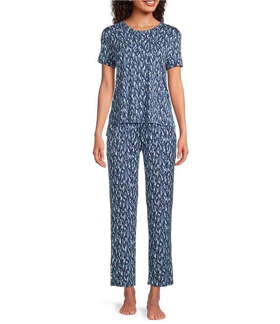 From Half Moon by Modern Movement, this lounge pant features: Stoke print Jersey knit fabrication Elastic waistband Side pockets Drawstring tie closure Approx. 28" inseam Modal/spandex Machine wash cold/tumble dry low Imported.