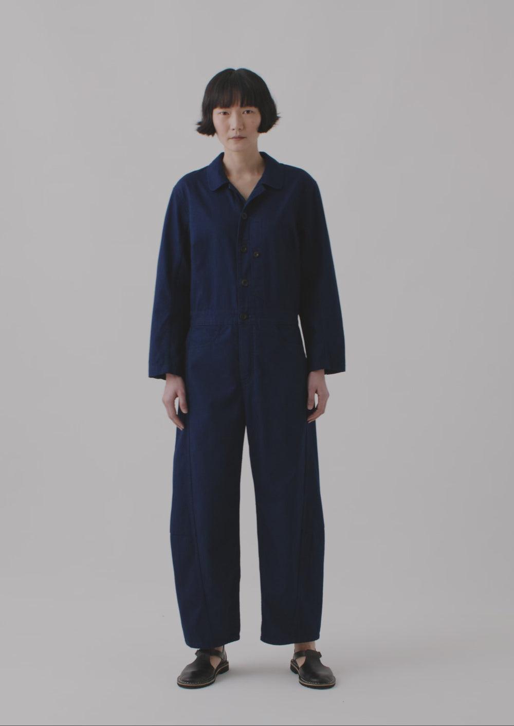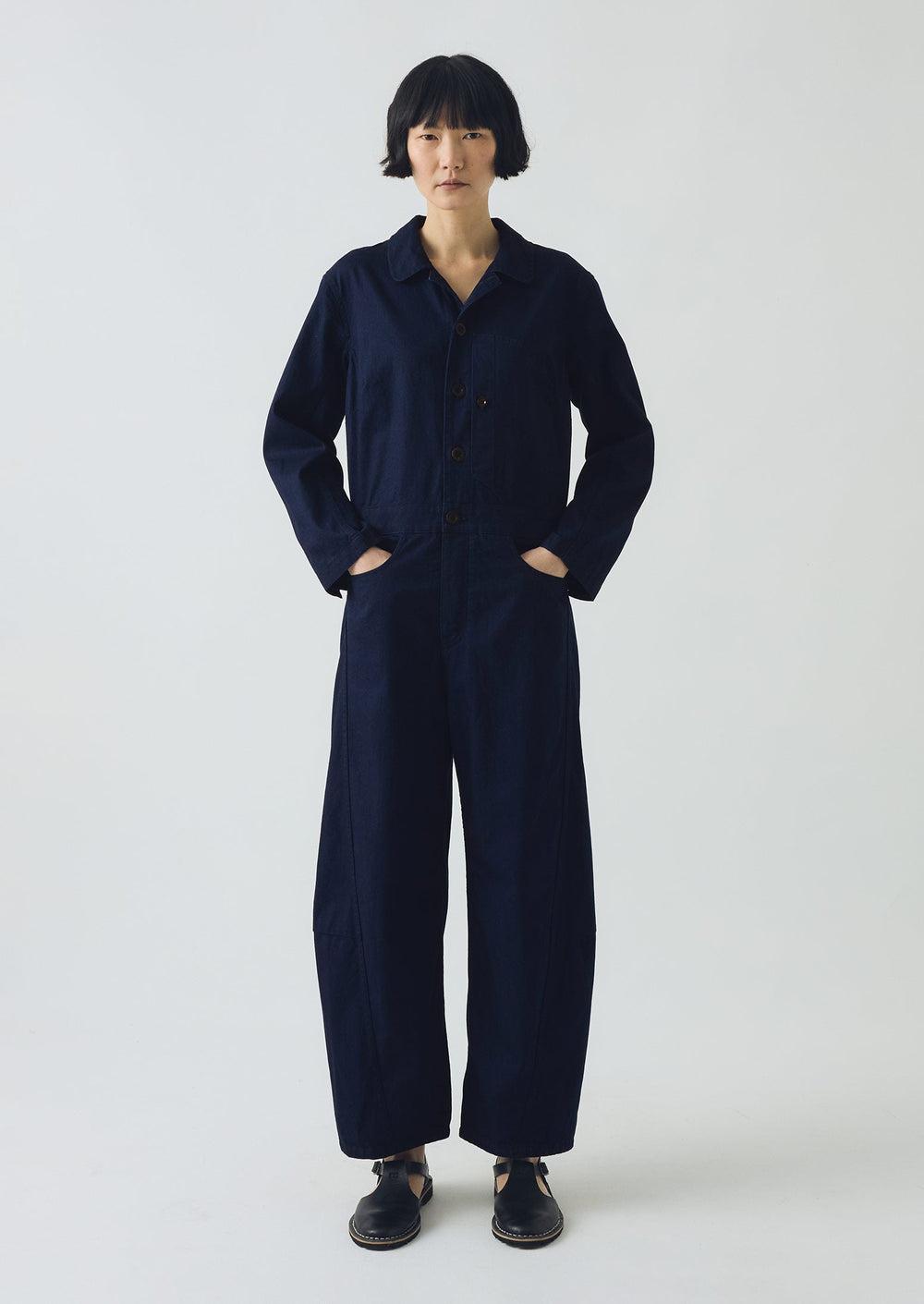 Jumpsuit. Indigo twill. Wide-leg. Patch pockets. Flat front waistband.