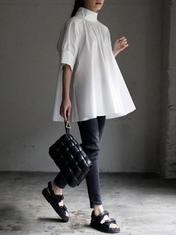 Half Sleeves Loose Solid Color High Neck Blouses&Shirts Tops