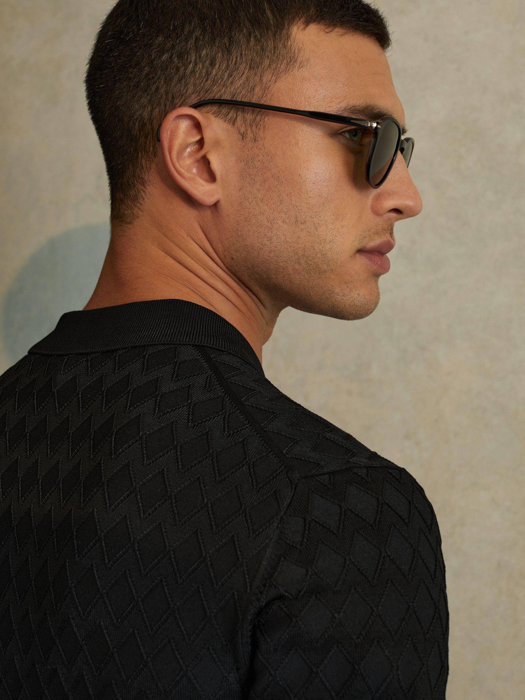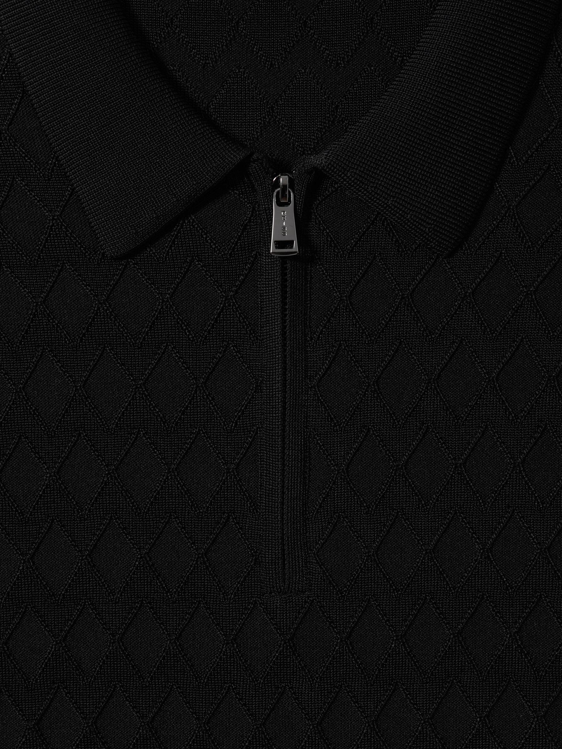 The Rizzo polo shirt is spun from a viscose blend for a premium sheen and a slinky feel against the skin. This diamond-knitted style blousons at the waistband for a relaxed look and zips it close at the neckline. Viscose blend. Diamond knitted construction. Half-zip neckline. The model is wearing a size M. Measurements of model: 6ft 2"/188cm.