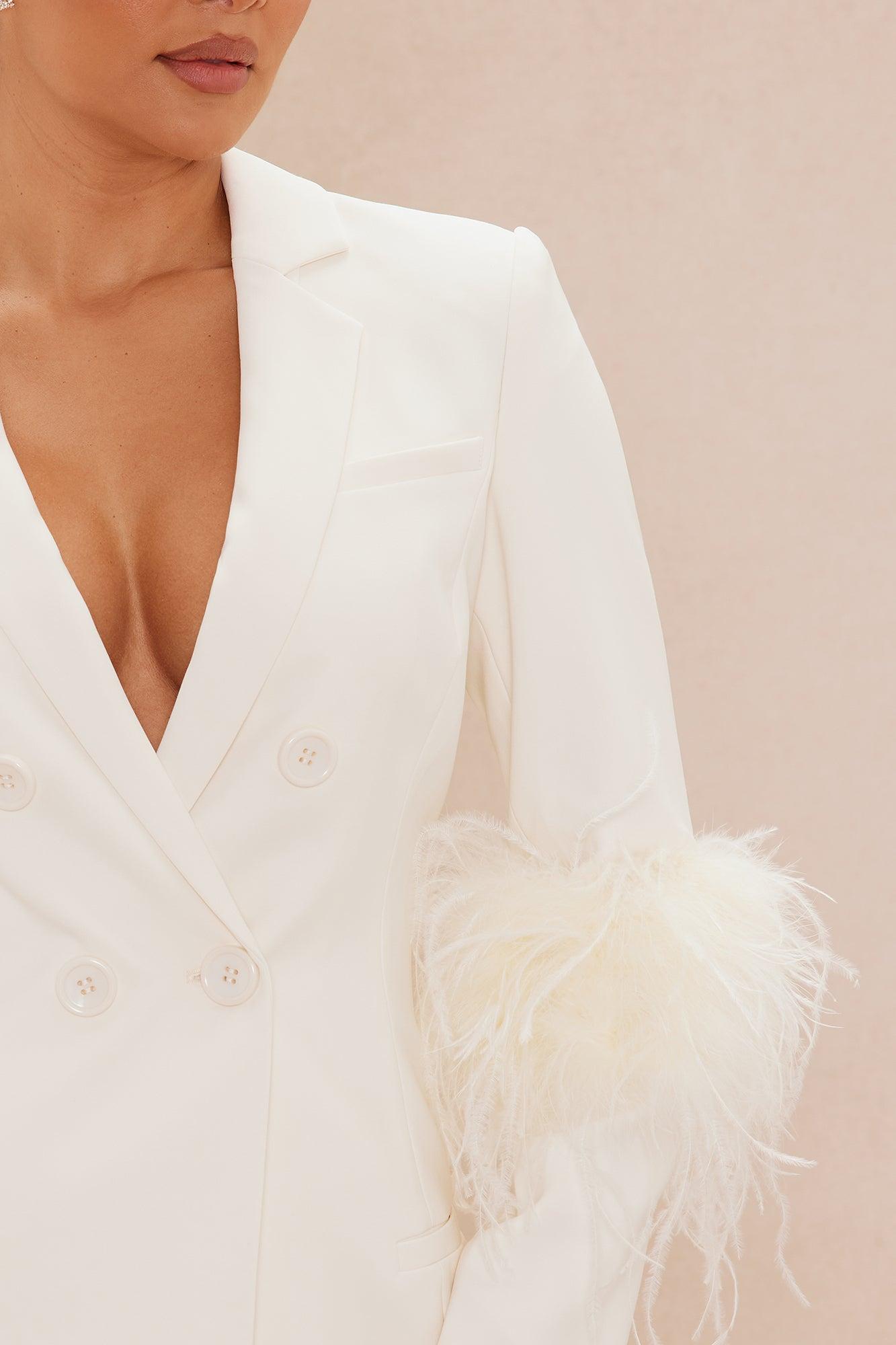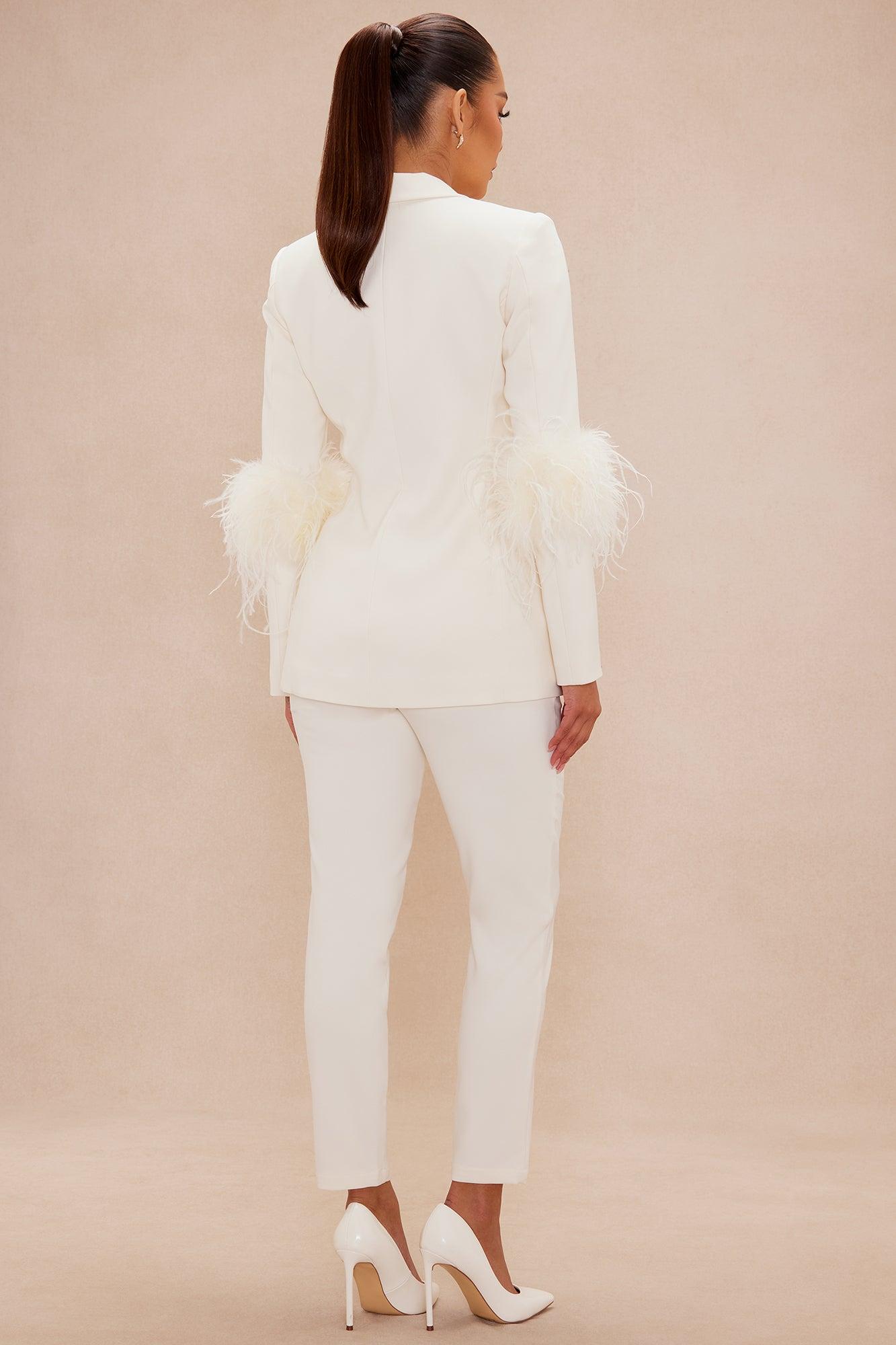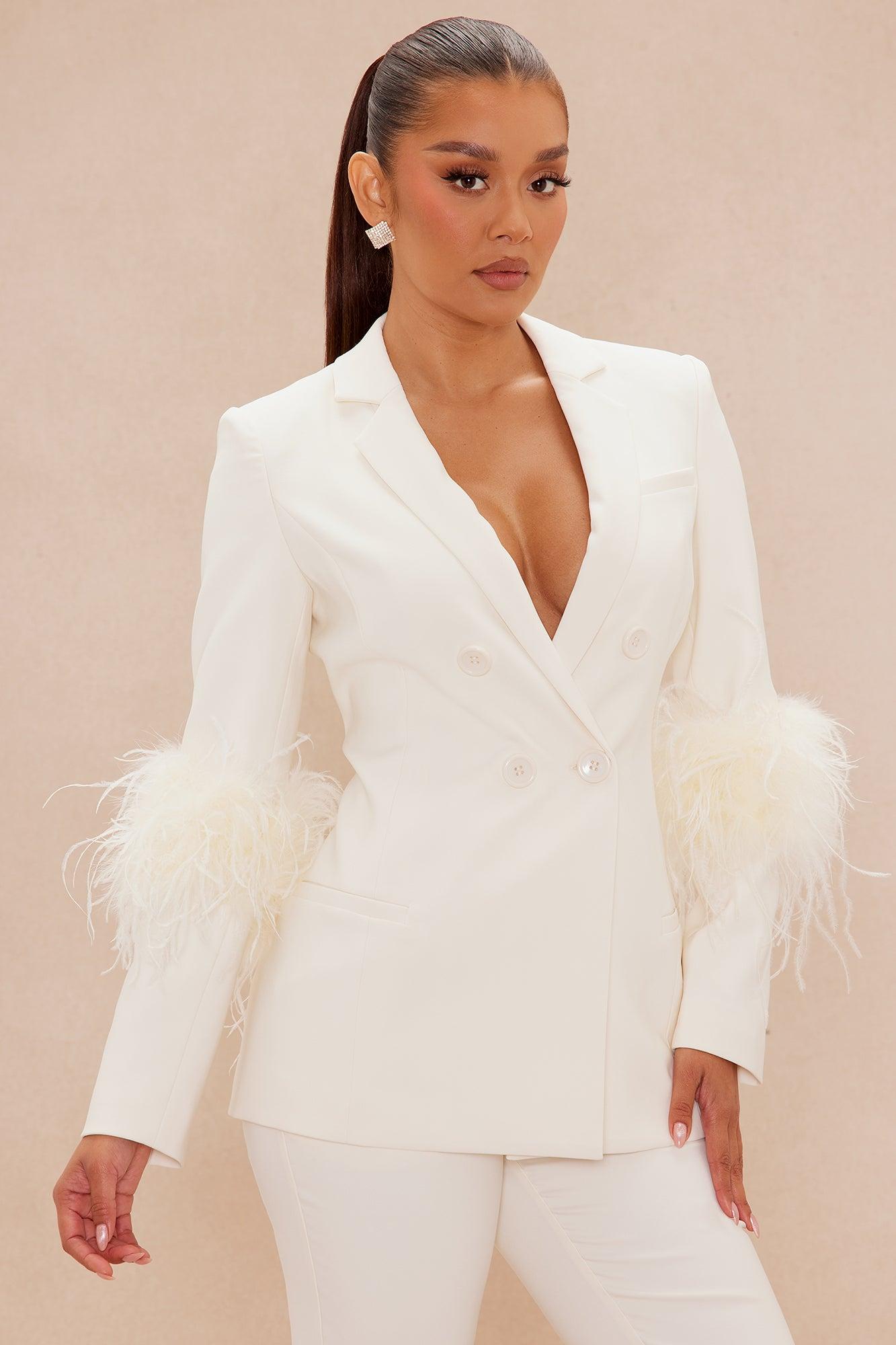 Available In Cream. Blazer Pant Ensemble Double Breasted Collar Long Sleeve Shoulder Pads Front Button Closure Feather Detail Straight Leg Pant, Pockets Front Zipper Closure Lined Some Stretch Shell: 95% Polyester 5% Spandex Lining: 95% Polyester 5% Spandex Decoration : 100% Ostrich feather Imported