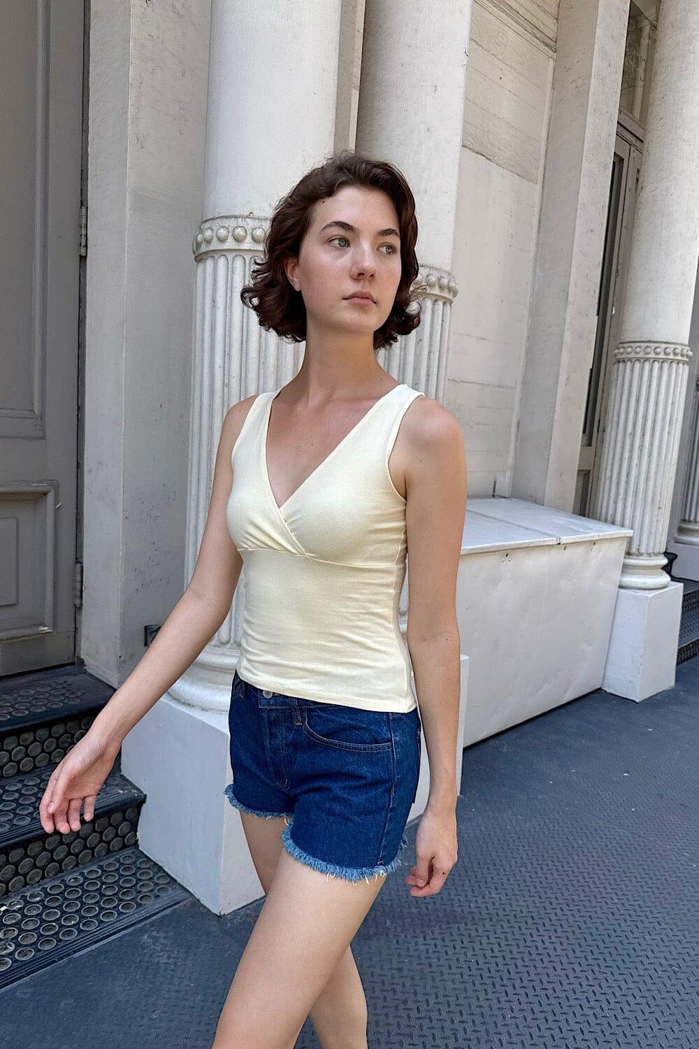 Crossover v-neck tank top with a seam under the bust.Fabrics: 96% cotton, 4% spandexMeasurements: 20" (51 cm) length, 14" (35.5 cm) bust Made in: China