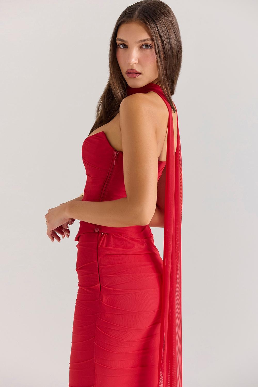 Embrace the romantic charm of our ‘Hallie’ Holly Red draped mesh corset top from the Enchanted Hour collection. This structured, boned bodice beautifully shapes and enhances your silhouette, creating an eye-catching neckline with a delicate peaked bustline for an effortlessly graceful look.