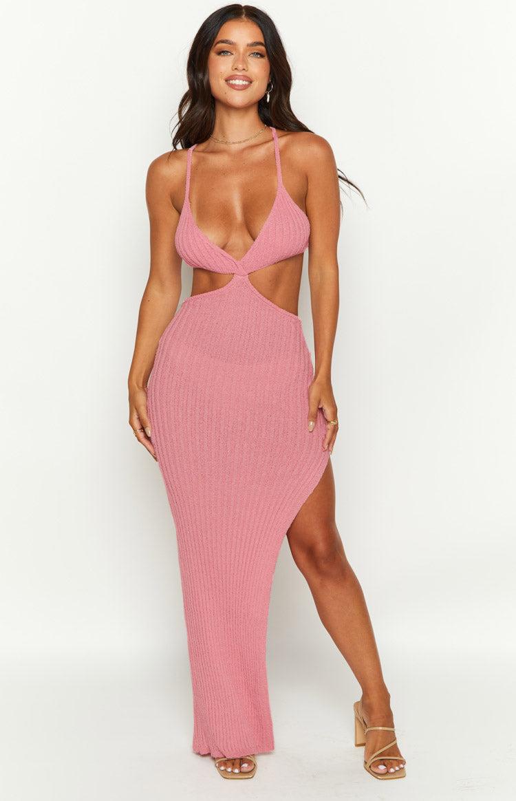 Pink Midi Dress Pack this pink knit midi for your next getaway. This breathtaking dress paired with heels and statement earrings is an essential! Midi length Mid-weight stretch material Unlined Side cuts outs Crossed back straps V neckline Side leg split Open back Slightly sheer This dress is perfect for homecoming!