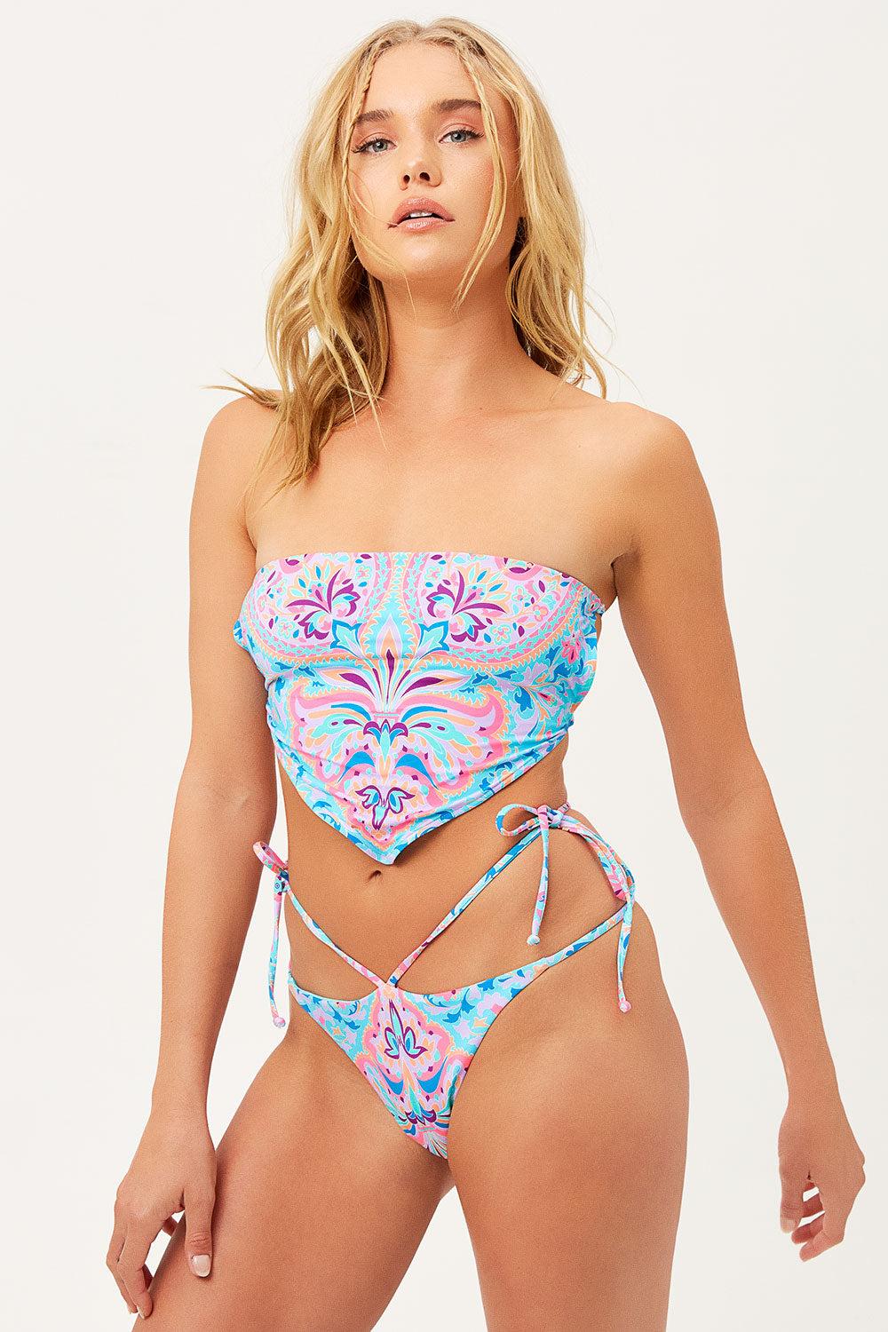 The Halo bikini bottom features a sultry low rise fit with added high-cut string side ties for some extra flair. Her flirty bikini bottom details and skimpy coverage will bring the heat all summer long. An upgrade to the classic string bikini bottom. Fabric 80% Nylon + 20% Spandex Skimpy Coverage Model Size & Fit This style runs true to size Brooke is wearing a size Small Height 5’10” (178cm) Bust 32” (81cm), Waist 24” (60cm), Hips 35” (89cm)