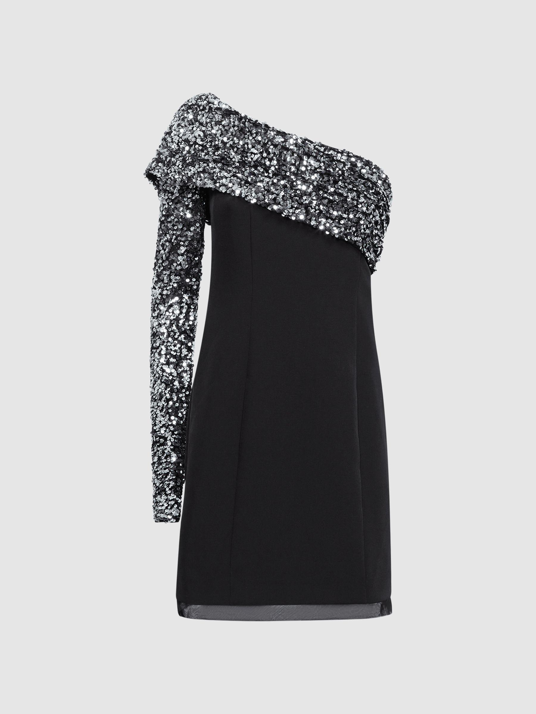 Halston, curated by Reiss, is a collection of 70s-inspired modern glamour gowns that remain true to our style philosophy. Signature occasionwear styles perfectly complement your existing Reiss wardrobe. Designed with VIP moments in mind, the black Karlyn dress is a dinner party staple. Its unique one-shoulder design showcases one long sleeve embellished with sequins for a dazzling impression. Pair with embellished accessories for the high-octane moments on your calendar. Sequin detailing Asymmetric neckline One-shoulder design Mini length The model is wearing a size 8 Measurements of model: Height 5ft 10" / 178cm