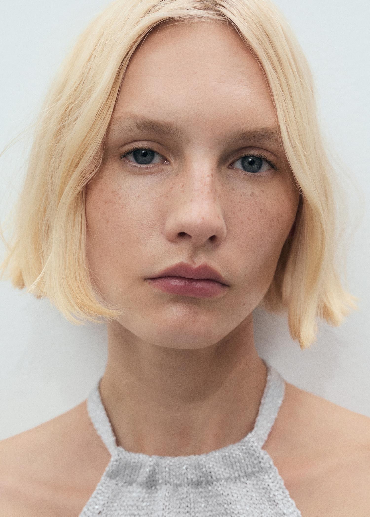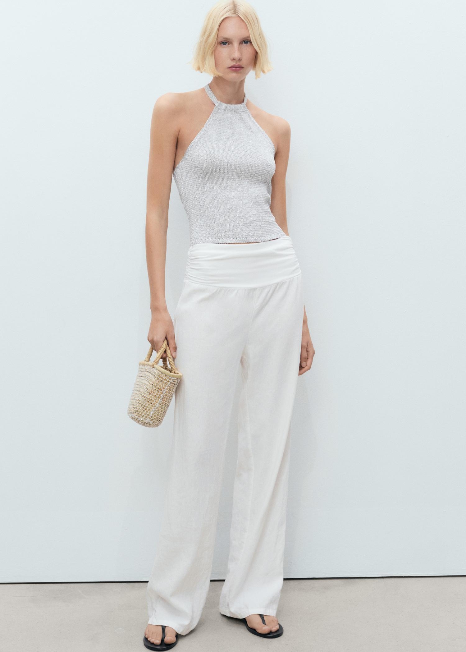 Fine knit fabric. Lurex detail. Fitted design. Halter neck. Open back. Bow fastening on the neck. Back length 11.61 in