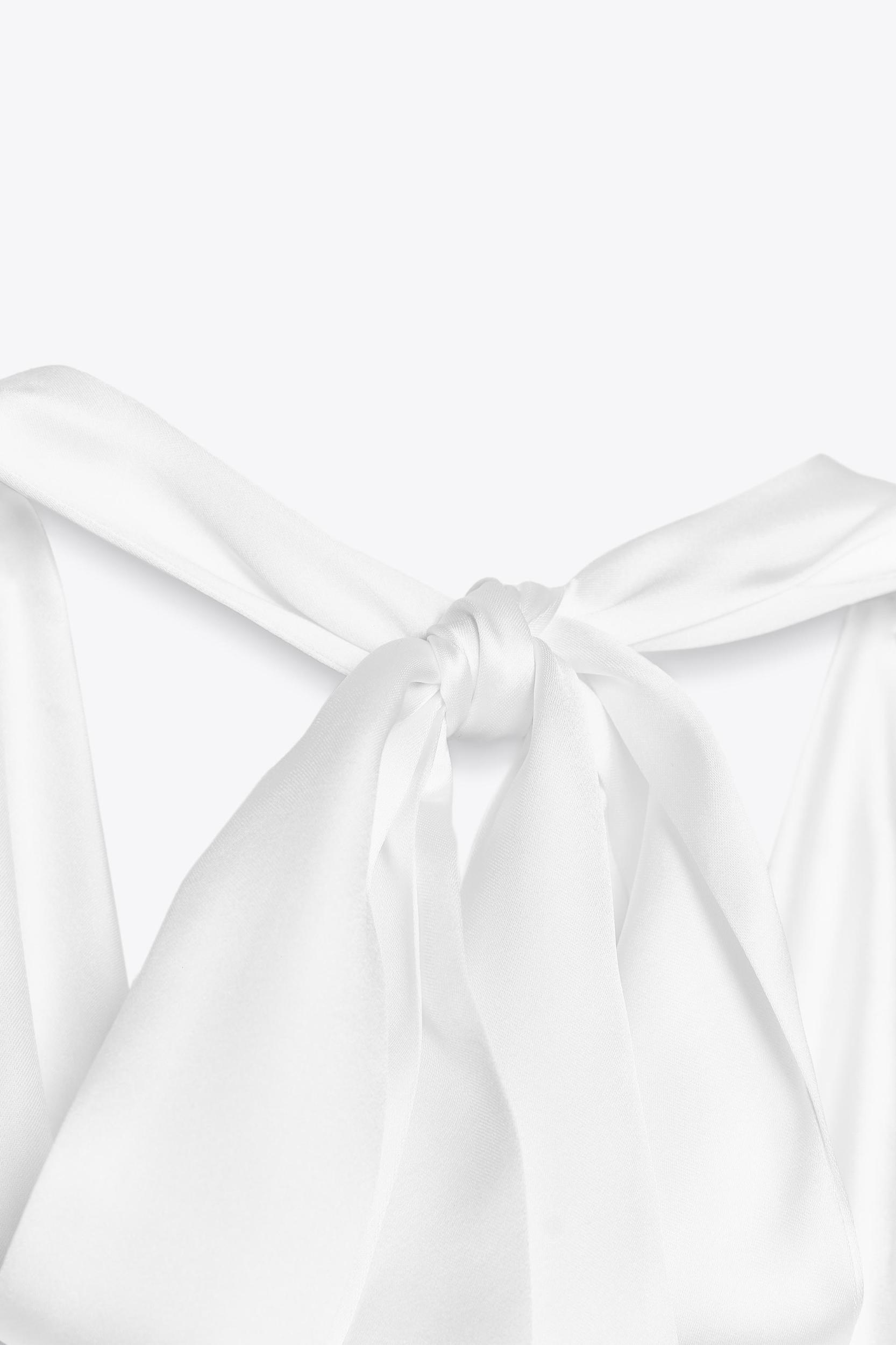Top made in satin fabric. Draped halter neck adjustable with neck tie. Open back with tie.