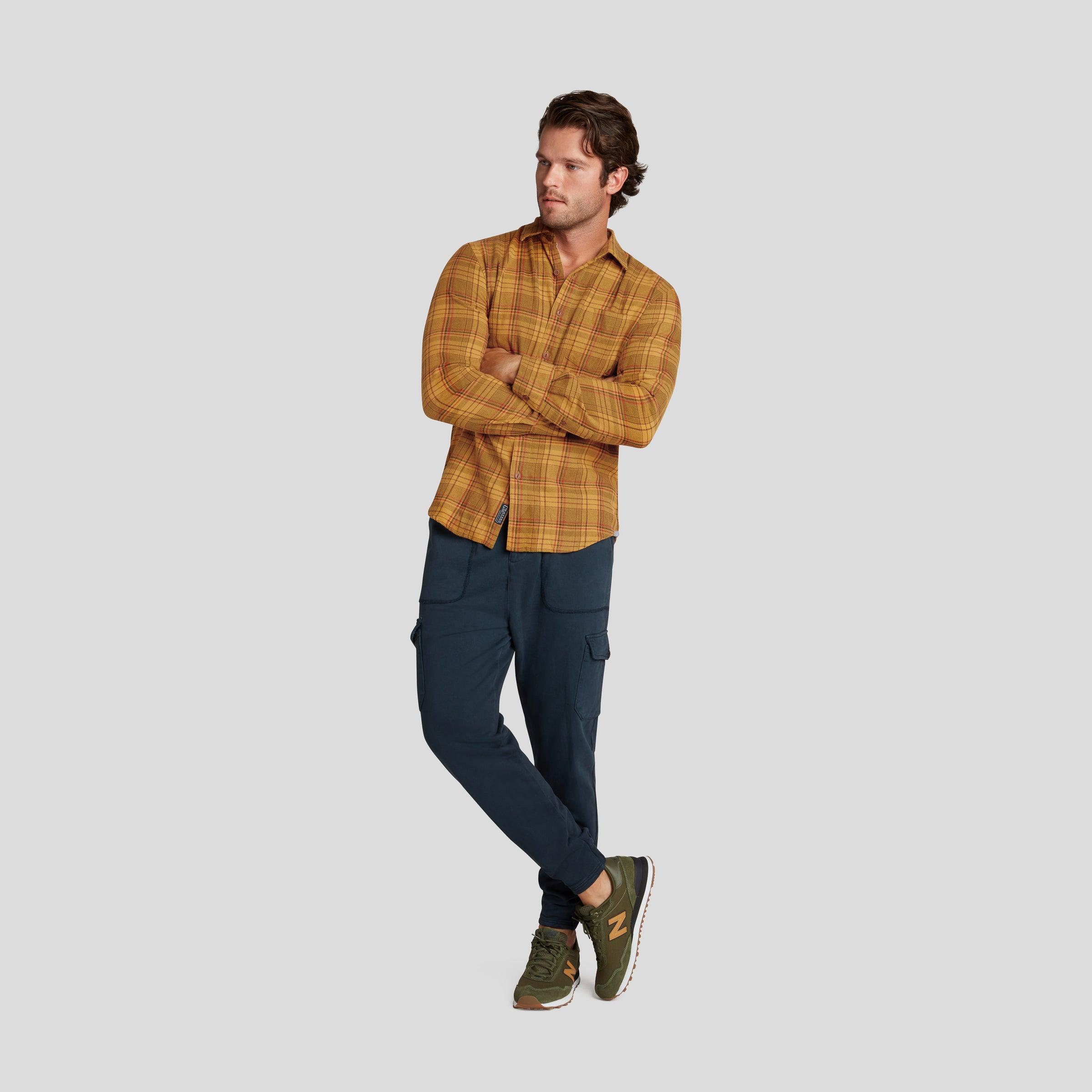 Cut in a modern fit (not too roomy, but not a slim fit) and over-dyed in crisp fall colors, these super-soft brushed twills weigh a comfortable 5 oz, making them ideal for the changing weather of the early fall months. The Model is also wearing: Defender Loopback Cargo Jogger - Graphite Blue Model: Jacob is wearing size medium and is 6'2". ----Details---- Modern fit 5 oz yarn dyed brushed twill flannel Garment dyed Spread collar Single patch pocket Faux nut colored fisheye buttons 100% Cotton Imported ----Materials---- 100% Cotton ----Size & Fit---- Measuring Method: All measurements are in inches and based on a “flat” garment, as shown below. For comparison with one of your existing garments, please lay garment on a flat surface and follow the key measurement points. For chest and neck, if you double the flat measurement, you will get close to the full body measurement. ----Care---- Machine Wash Cold Separately Do Not Soak Before Washing Do Not Bleach Remove Promptly Tumble Dry Low Or Hang Dry In Shaded Area Cool Iron If Necessary