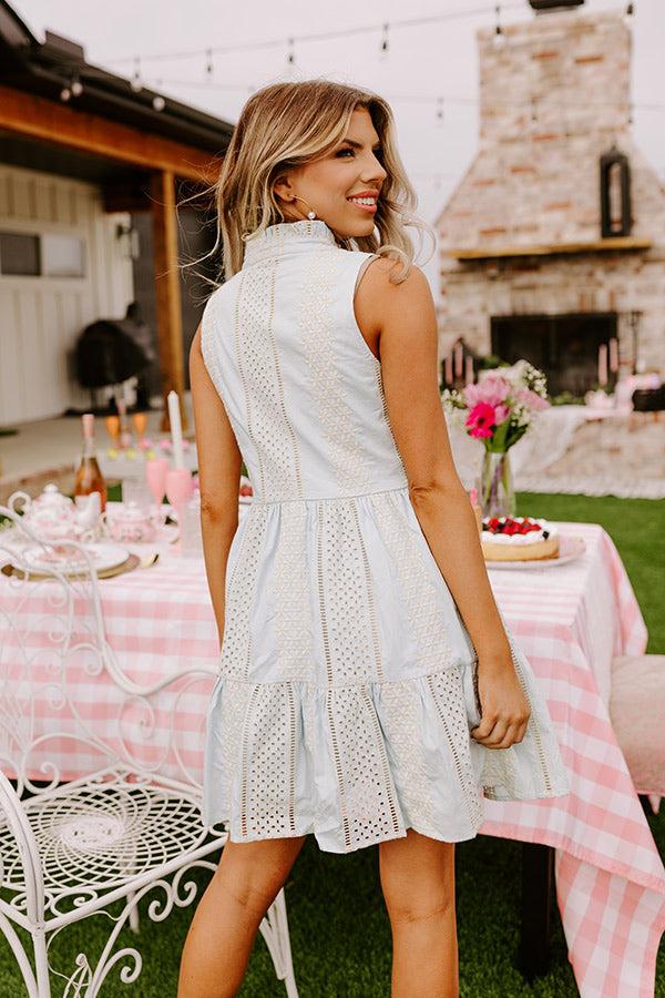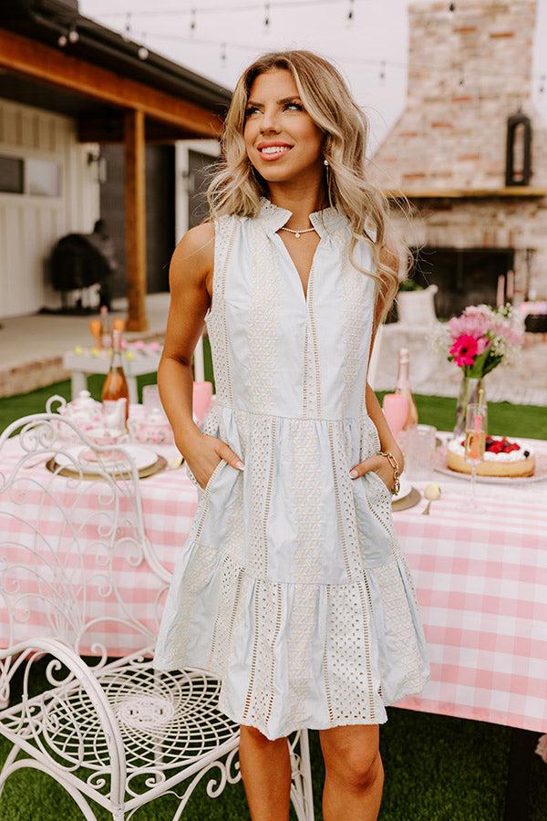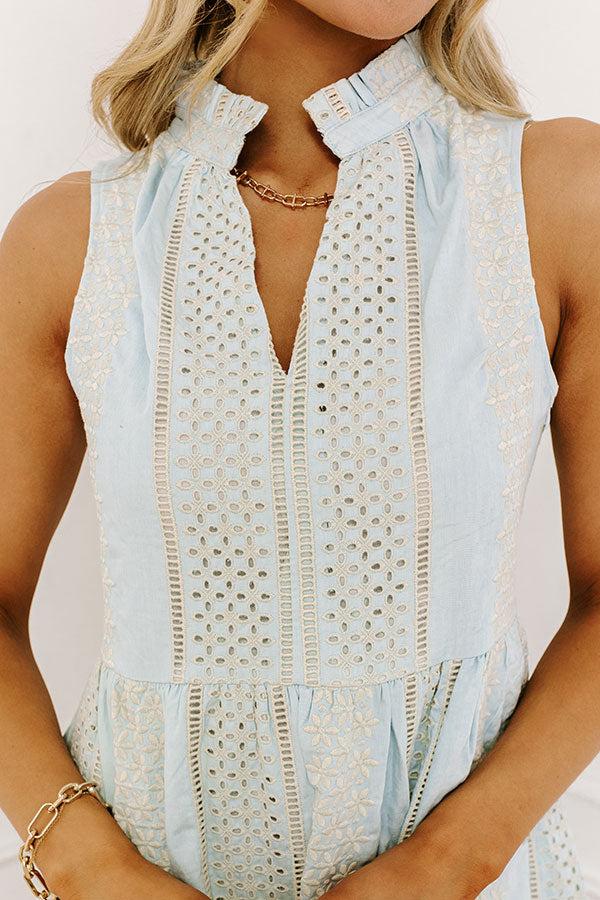 You will look like you're clothed in luxury when you wear this adorable light blue dress featuring lightweight material with eyelet detailing, a v-cut neckline with a high collar, wide sleeveless shoulder straps, hidden side pockets, and a relaxed silhouette that falls into a straight mid-thigh length peplum hemline! Measurements S : Bust 32", Hip 38", Length 32.5", Waist 30". M : Bust 34", Hip 40", Length 33", Waist 32". L : Bust 36", Hip 42", Length 34", Waist 34".