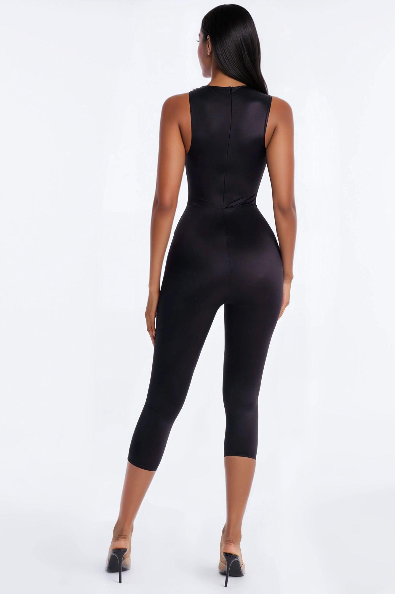 Available In Black And Red. Jumpsuit Stretch Sleeveless Capri Jumpsuit High Neck Skinny Capri Leg Invisible Back Zipper 19" Inseam Self : 76% Nylon 24% Spandex Lining : 76% Nylon 24% Spandex Imported California Proposition 65WARNING: Cancer and Reproductive Harm - www.P65Warnings.ca.gov.