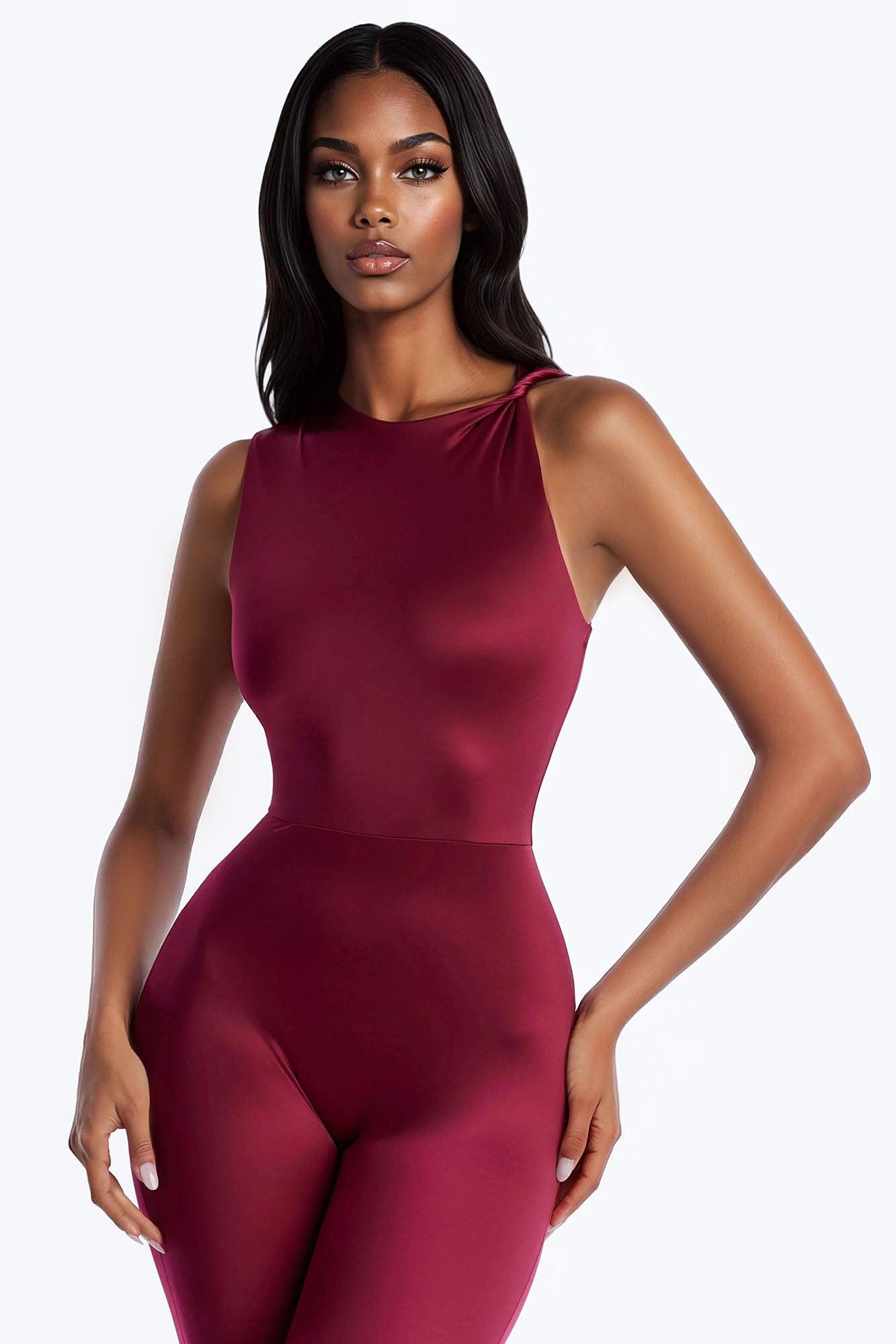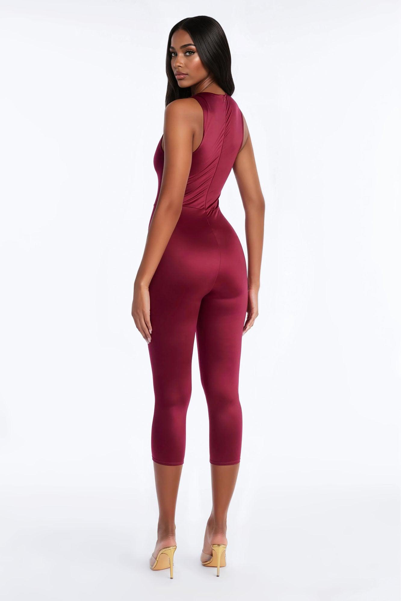Available In Black And Red. Jumpsuit Stretch Sleeveless Capri Jumpsuit High Neck Skinny Capri Leg Invisible Back Zipper 19" Inseam Self : 76% Nylon 24% Spandex Lining : 76% Nylon 24% Spandex Imported California Proposition 65WARNING: Cancer and Reproductive Harm - www.P65Warnings.ca.gov.