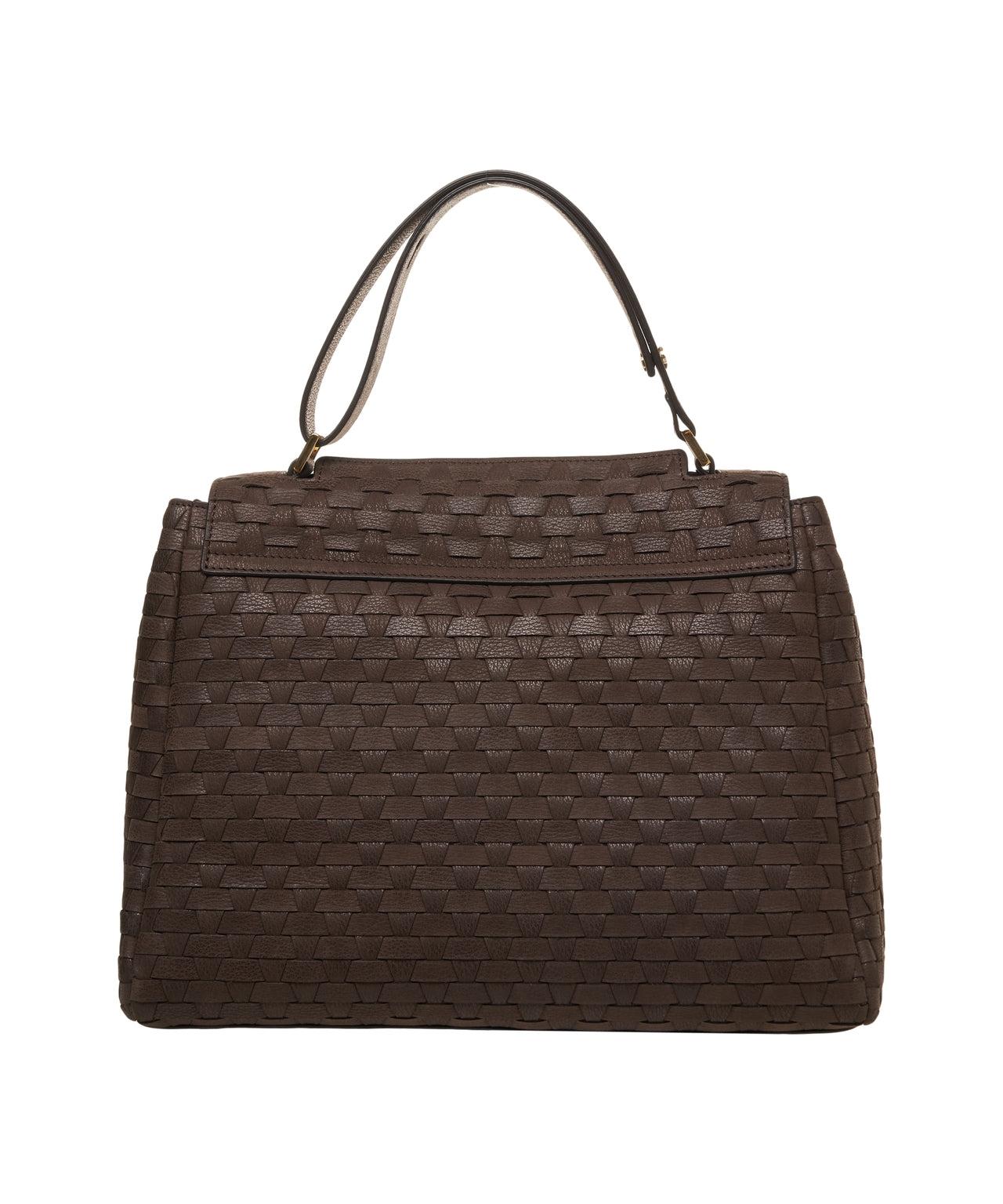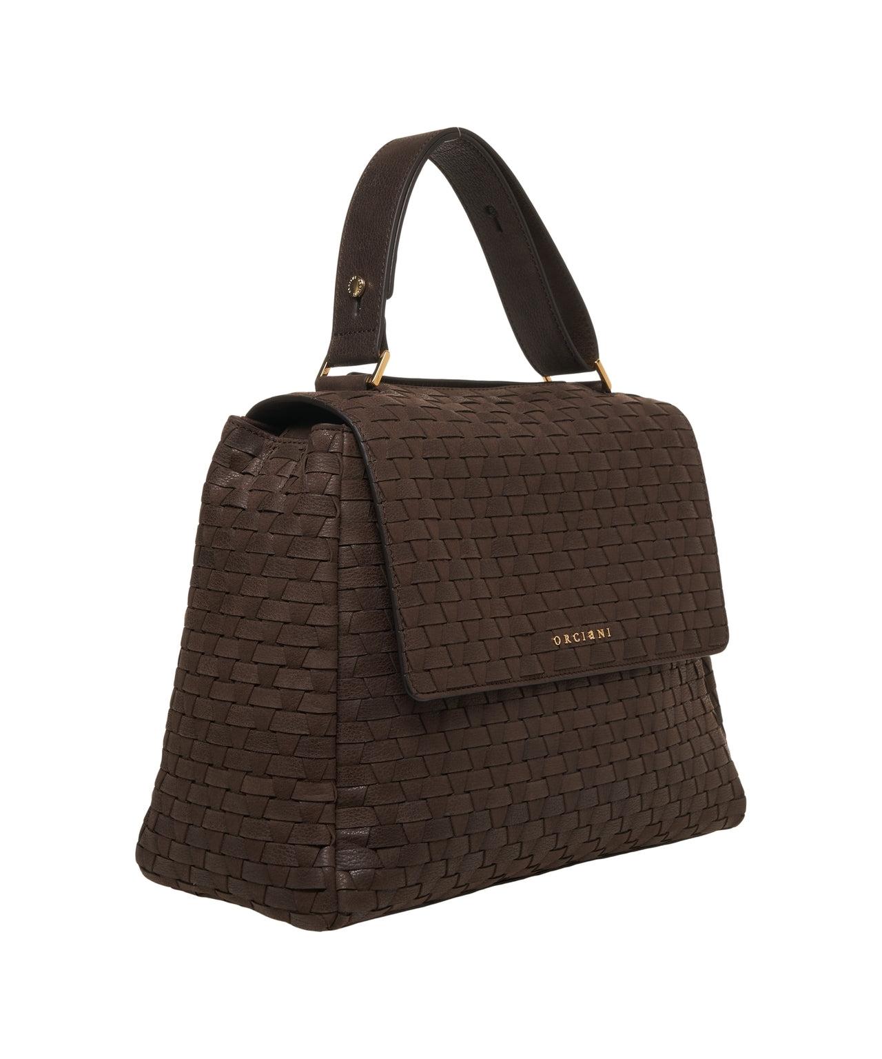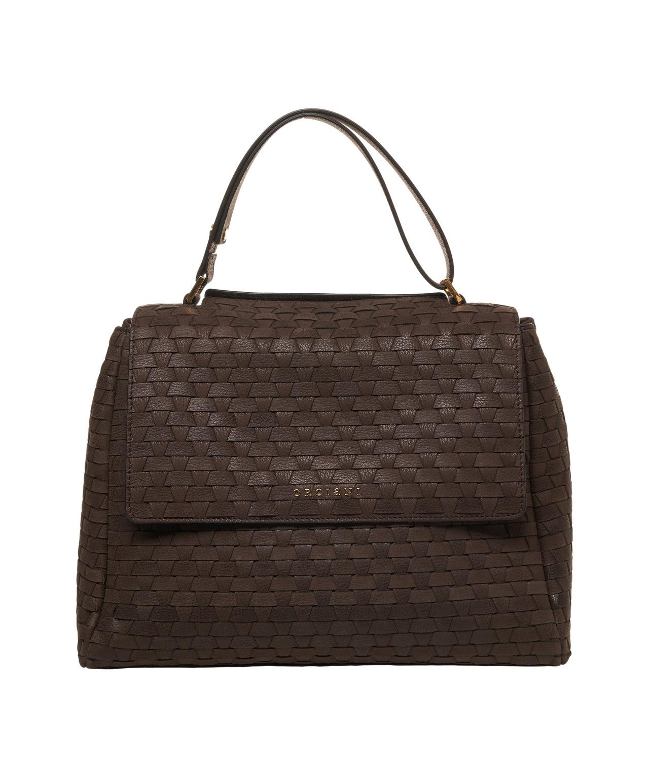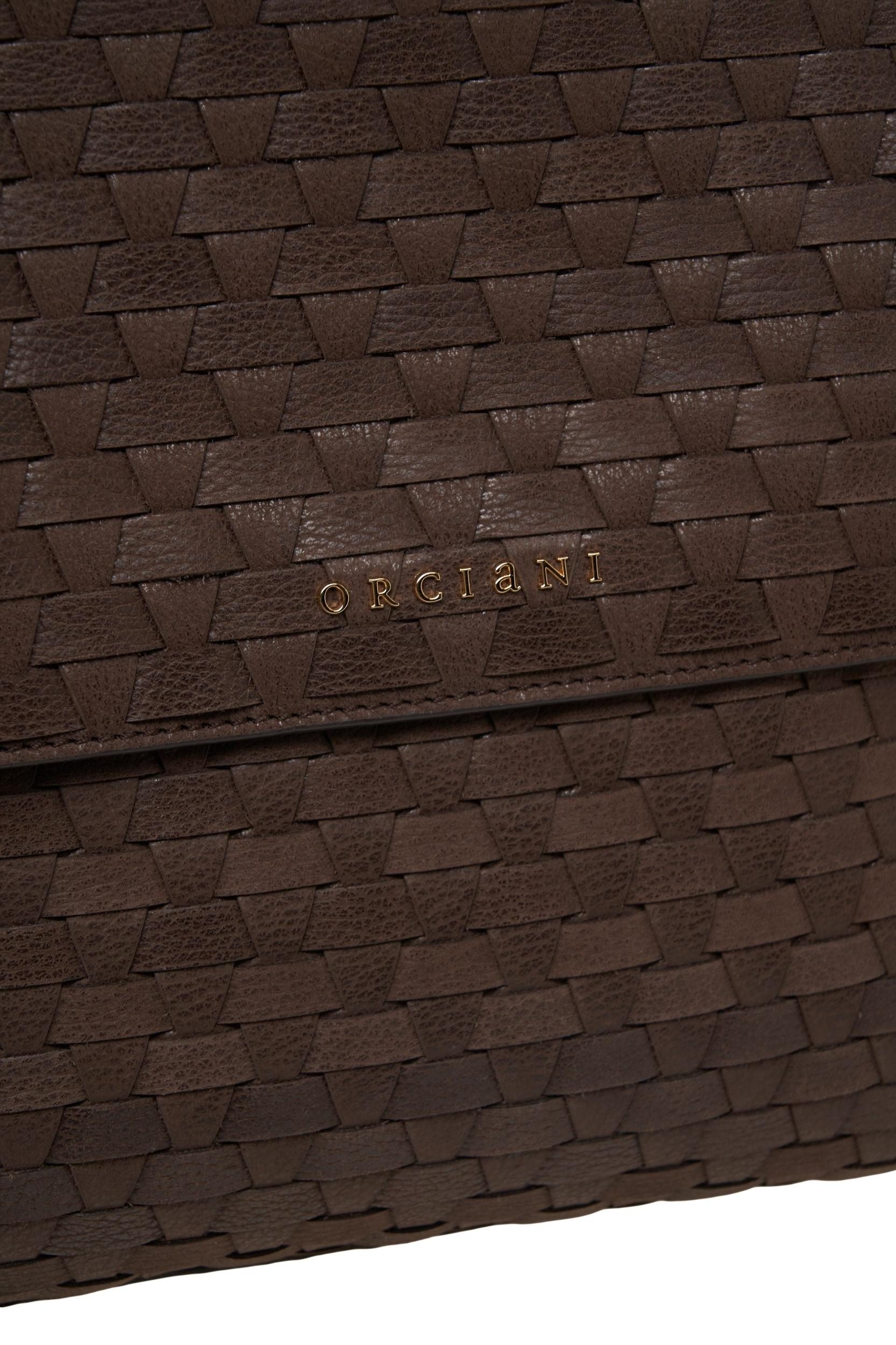 This exquisite Orciani handbag impresses with its unique woven leather design. Crafted in Italy, it features an elegant top handle and a practical shoulder strap for versatile wear. The stylish flap with a distinctive logo and magnetic closure completes this luxurious accessory, offering ample space for your essentials.Made in ItalyLeatherWoven detailSingle handleShoulder strapFlap with magnetic snap closureGold-colored logo details