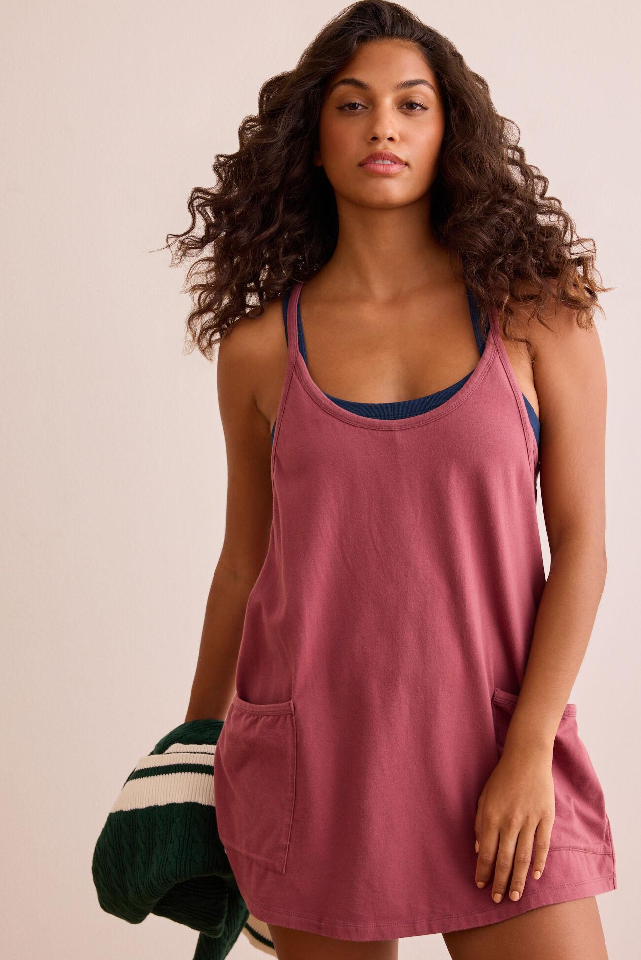 Instantly elevate your athleisure looks with this mini dress. Guaranteed to be a new go-to, this piece features an effortless style with front pockets, a V-neck, and cozy relaxed fit. The built in romper underneath allows for movement and maximum comfort.