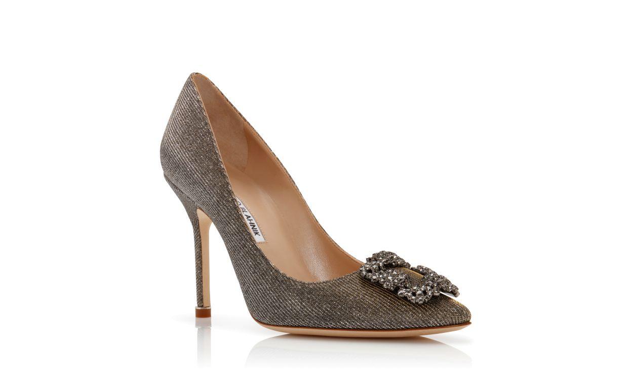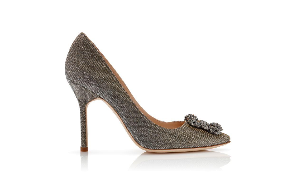 Gold glitter fabric almond toe pumps featuring a square crystal buckle encased in a gunmetal frame. Finished with a stiletto high heel.
