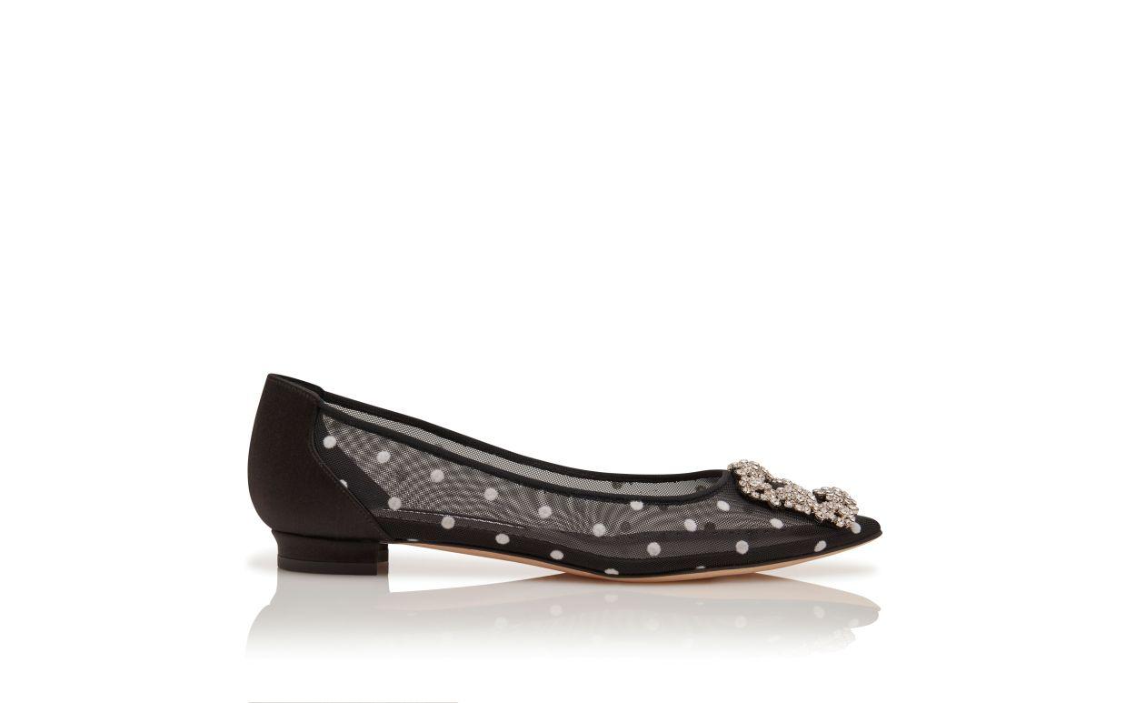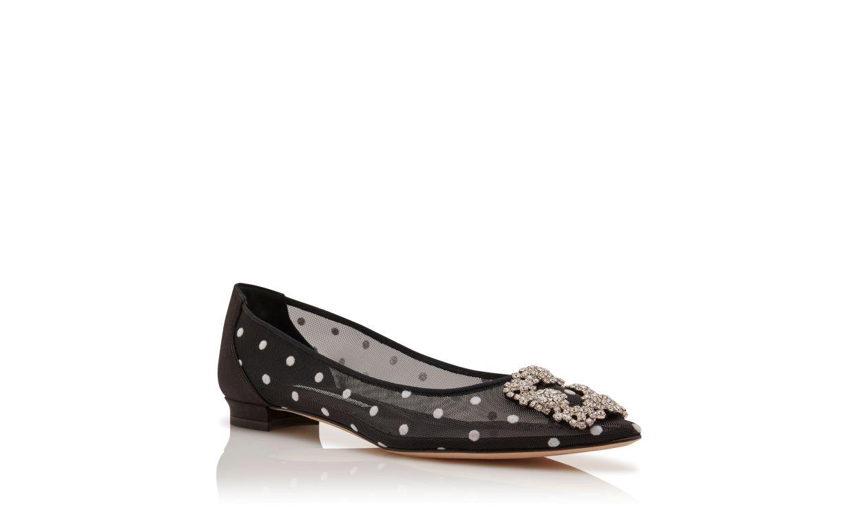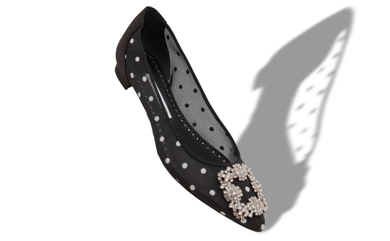 Black mesh almond toe flat pumps featuring white polka dot design, square clear crystal buckle and satin counter. Finished with flat stacked heel.