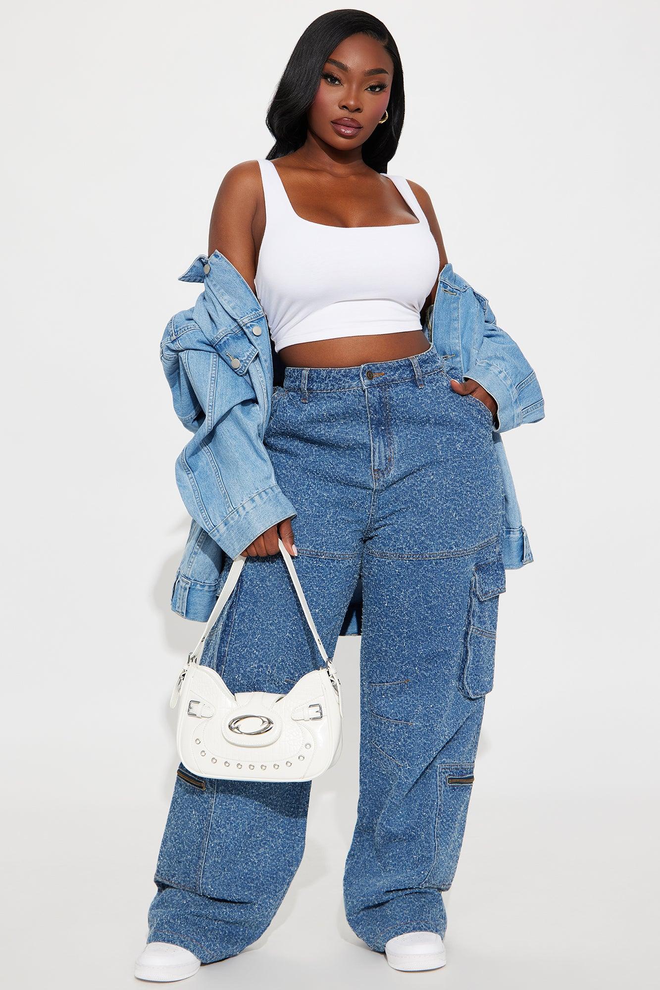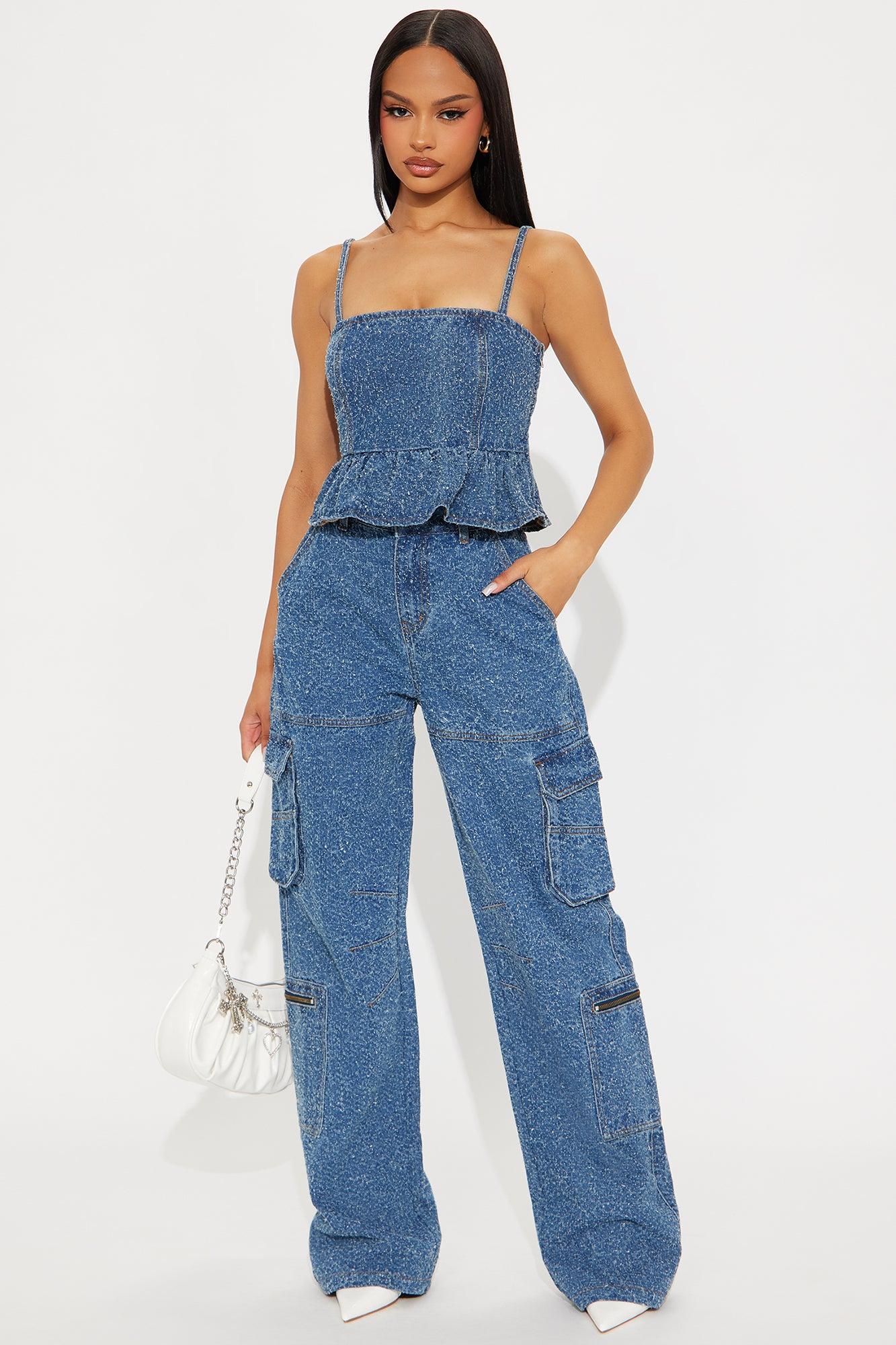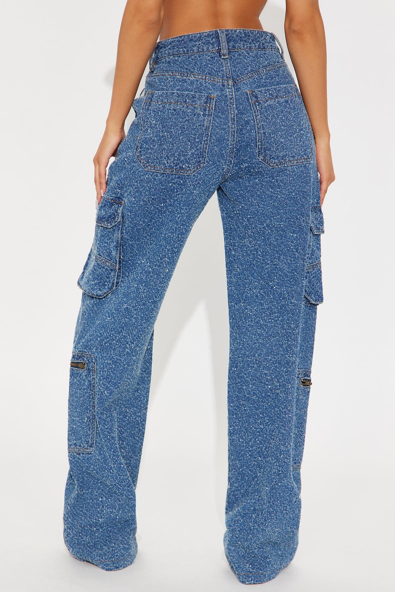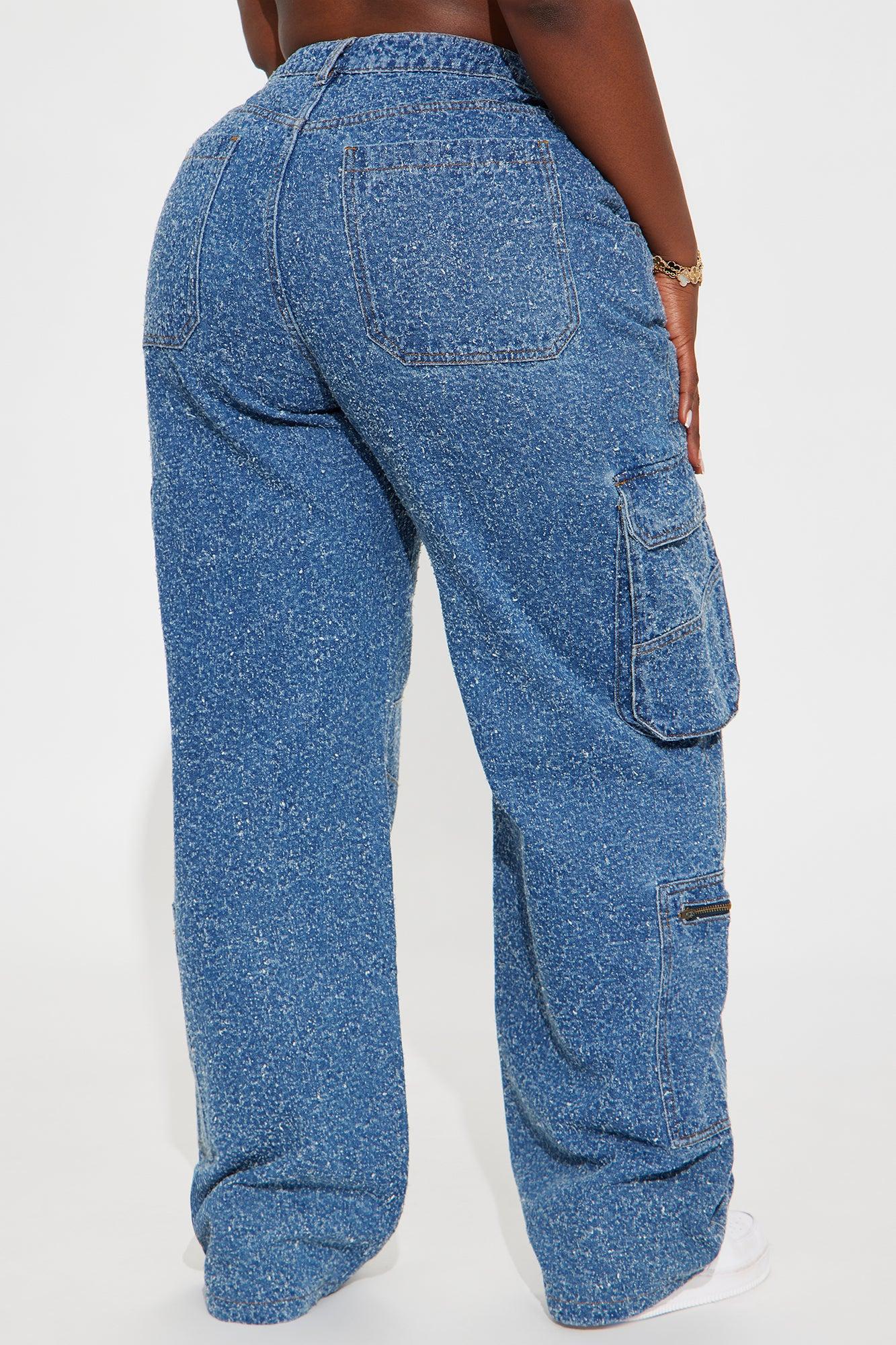 Available In Medium Wash. Pair With "Hanna Textured Denim Top" Non-Stretch Cargo Loose Fit Straight Leg 34" Inseam 12" High Rise 75% Cotton 25% Polyester Imported California Proposition 65WARNING: Cancer and Reproductive Harm - www.P65Warnings.ca.gov.