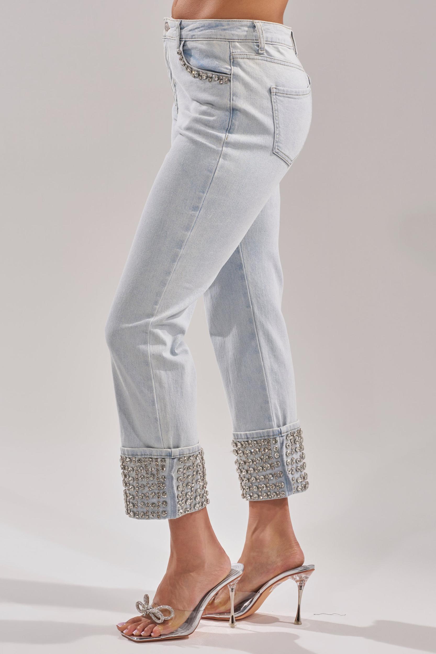 Bling out, babe. The AKIRA Label Hanni Rhinestone Denim Cropped Pant is crafted from a light-wash denim and features a high-rise fit, functional belt loops, a classic five-pocket design, and glittering rhinestone trim on the front pockets and on the folded pant cuffs. Complete with a button-zip front closure, and a cropped, straight-leg silhouette. - 99% Cotton 1% Spandex- Slight Stretch- Imported (all measurements approximate from size 26)- 10.5” Rise- 27” InseamProduct ID: 1069531