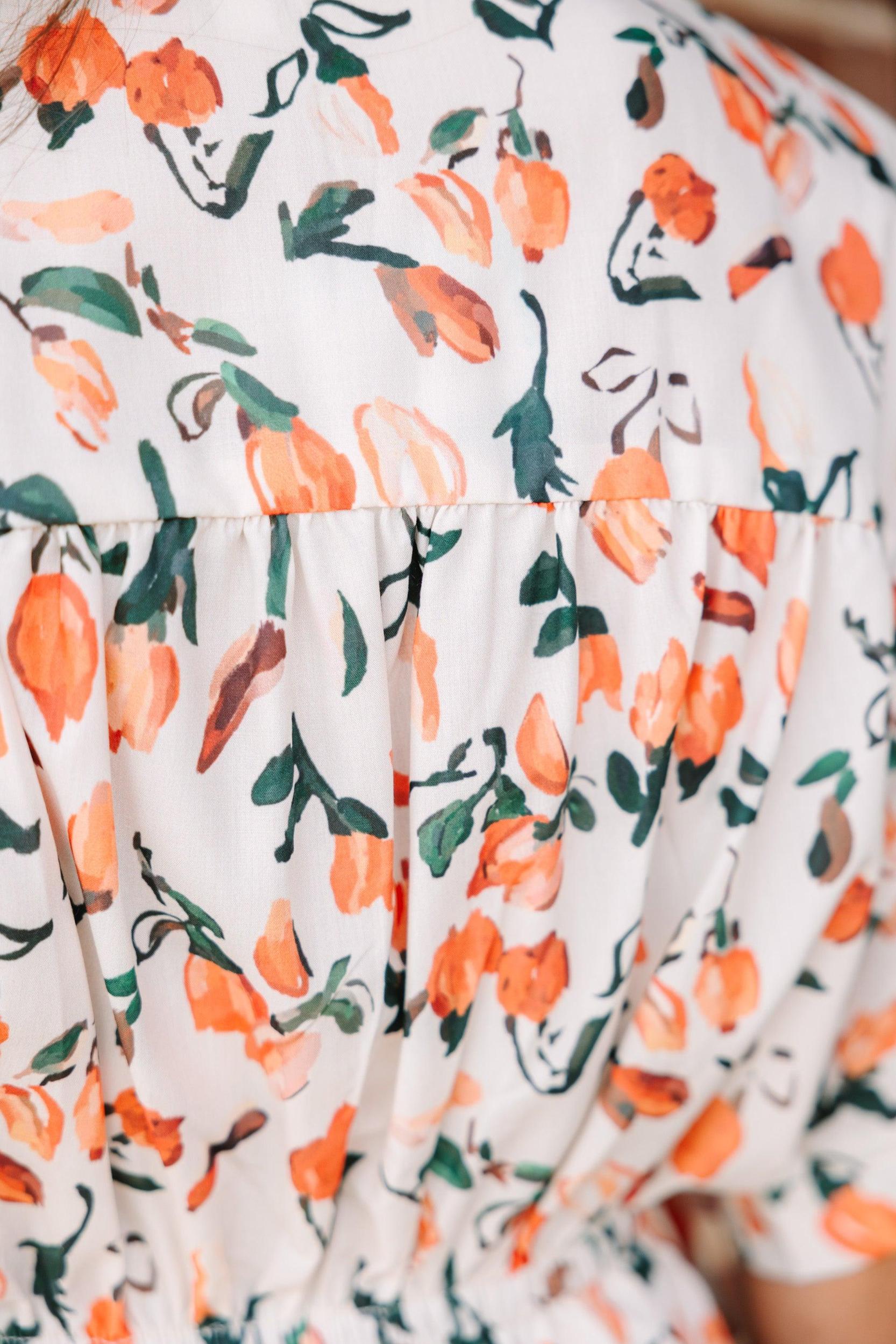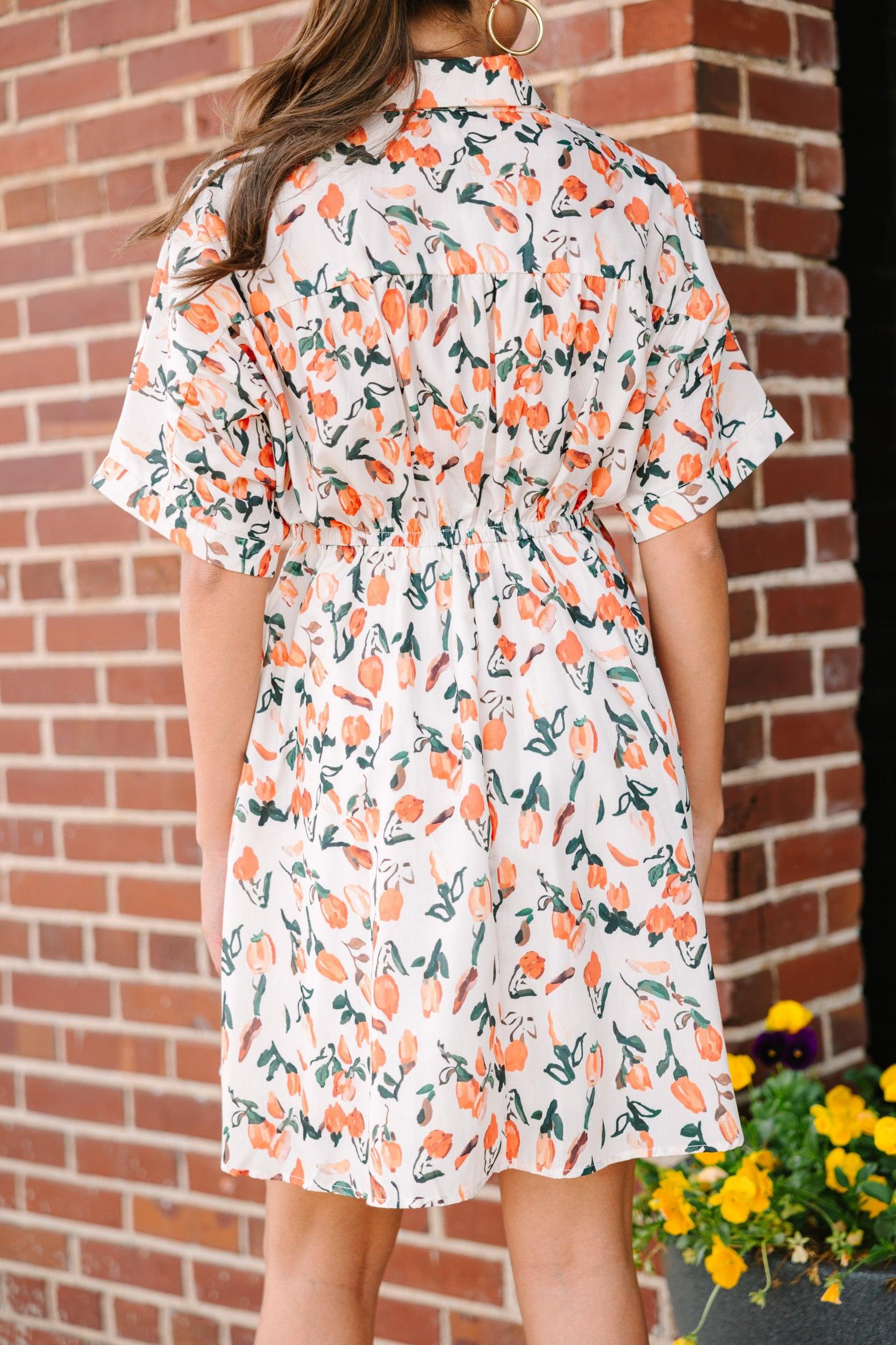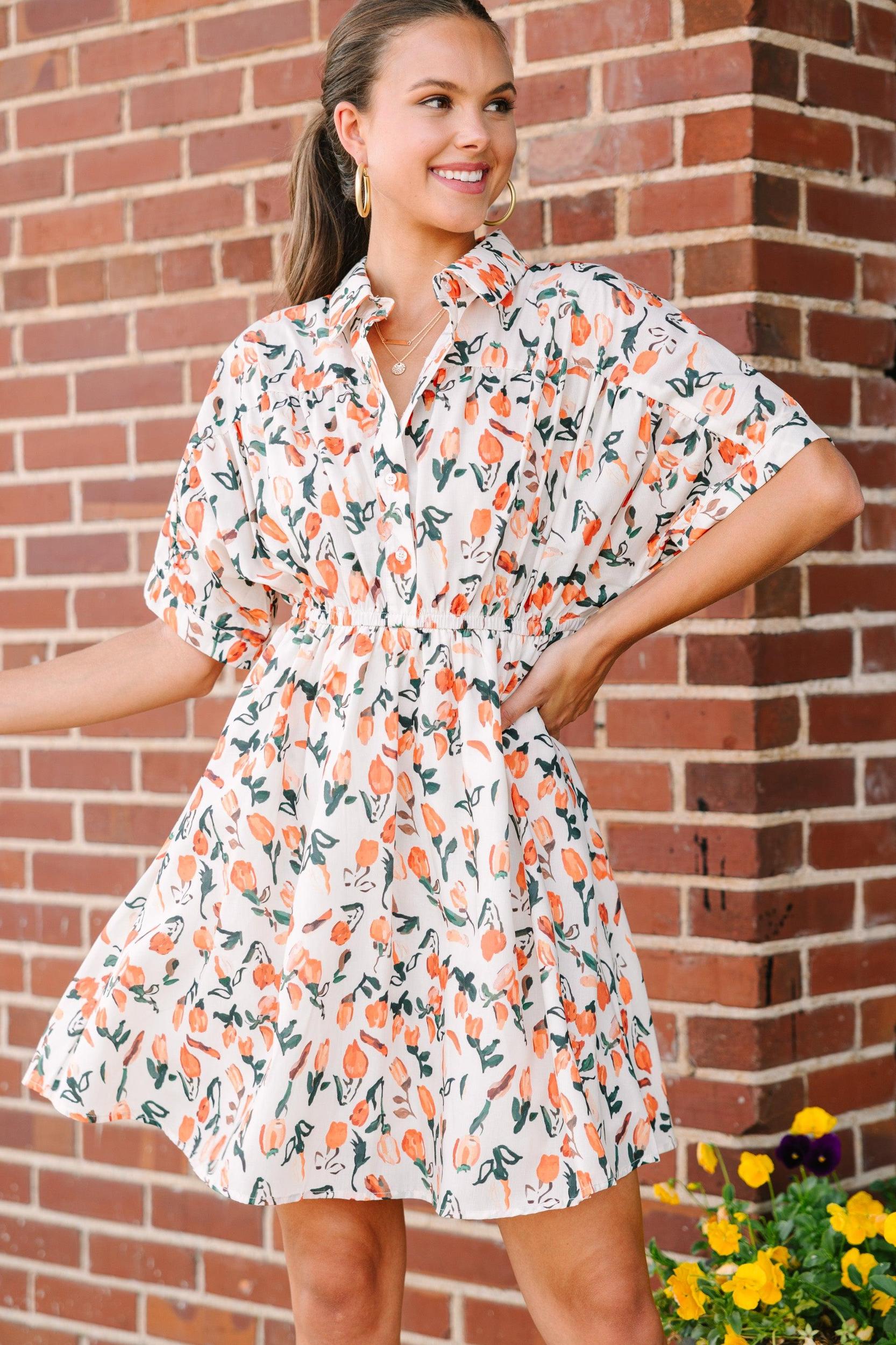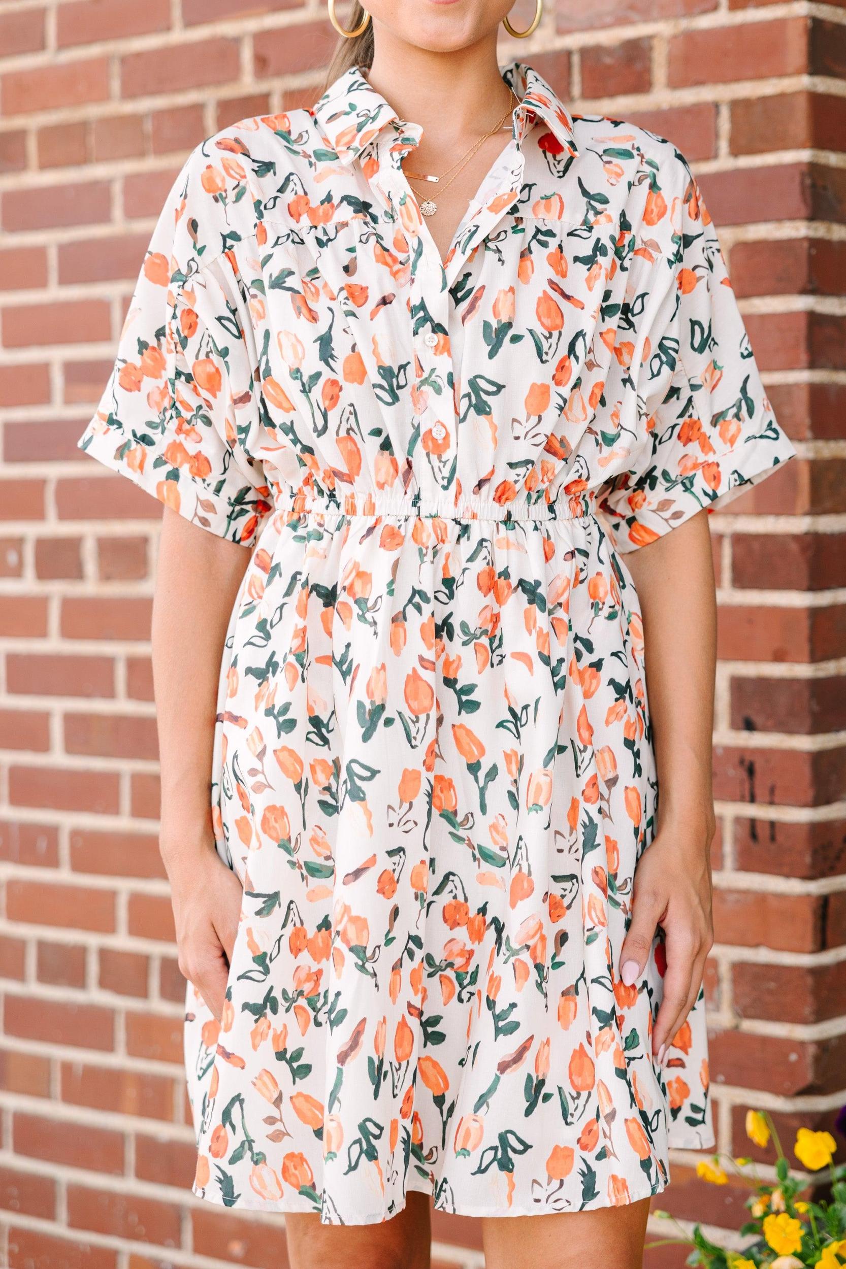 Happy days are definitely here! Have you seen this dress?! That floral print is stunningly perfect for this time of year! Those hues are year round perfection! Plus, that elastic waist keeps this dress both flattering and comfy! Collared neckline Partial button down neckline Elastic waist Short sleeves Floral print No stretch however the elastic extends the waist Sydney is wearing the small.