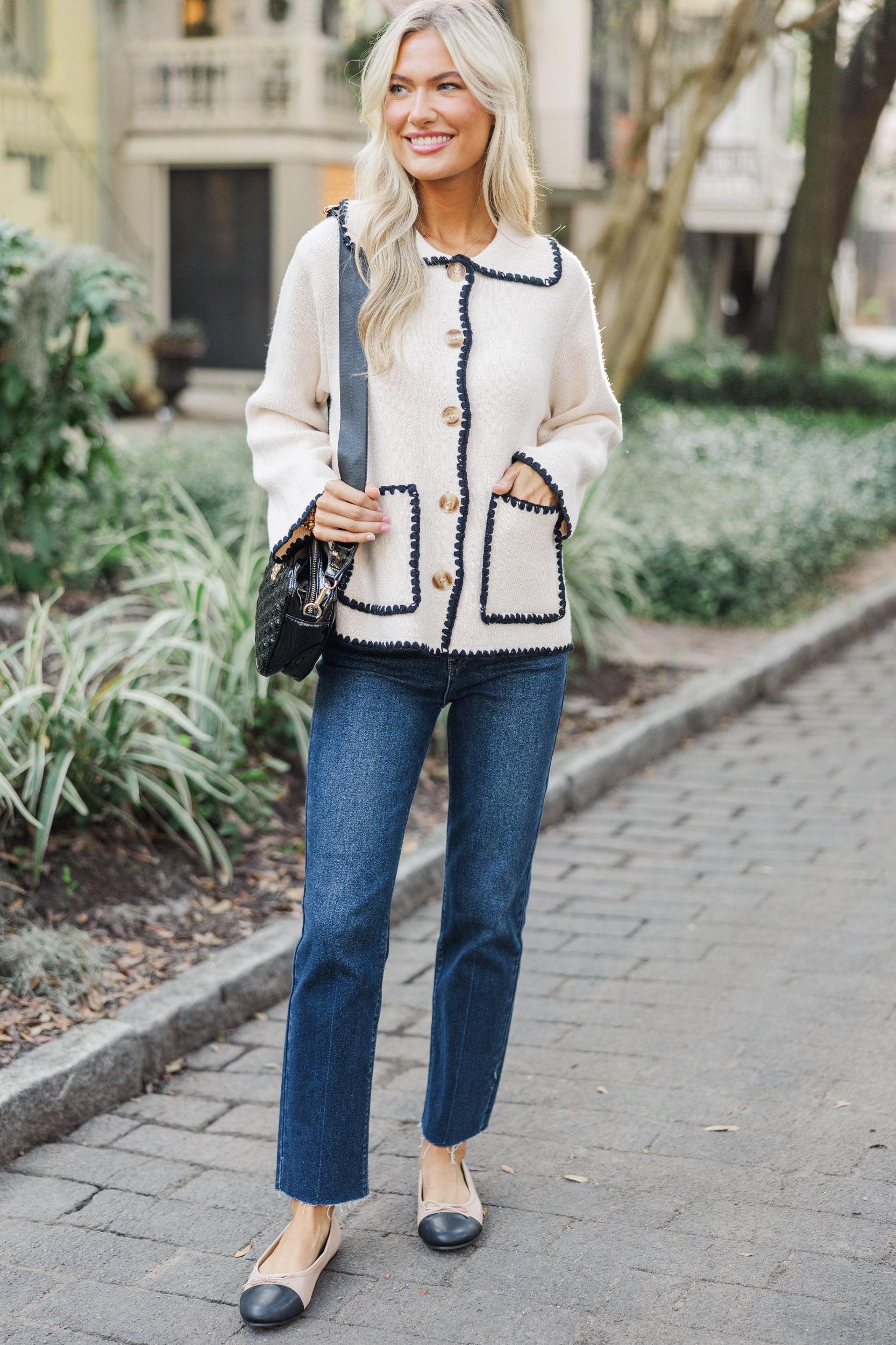 There are definitely happy days ahead with this cardigan! That knit fabric is so cozy and we are loving the navy stitched edges! This preppy cardigan is going to look fab for work days or any occasion where you want to look like you have it all together! Collered neckline Button down front closure Long sleeves Front pockets Navy stitching Generous stretch Baileigh is wearing the small.