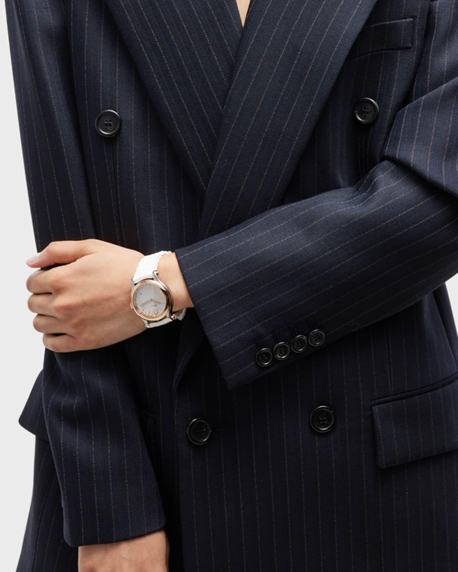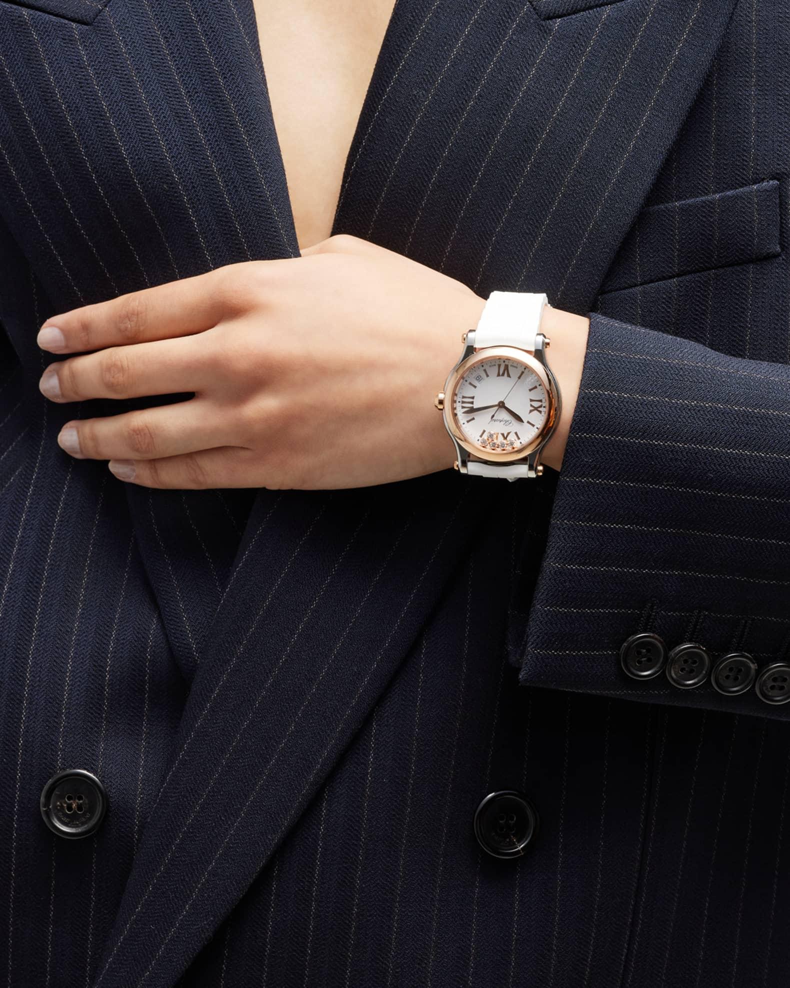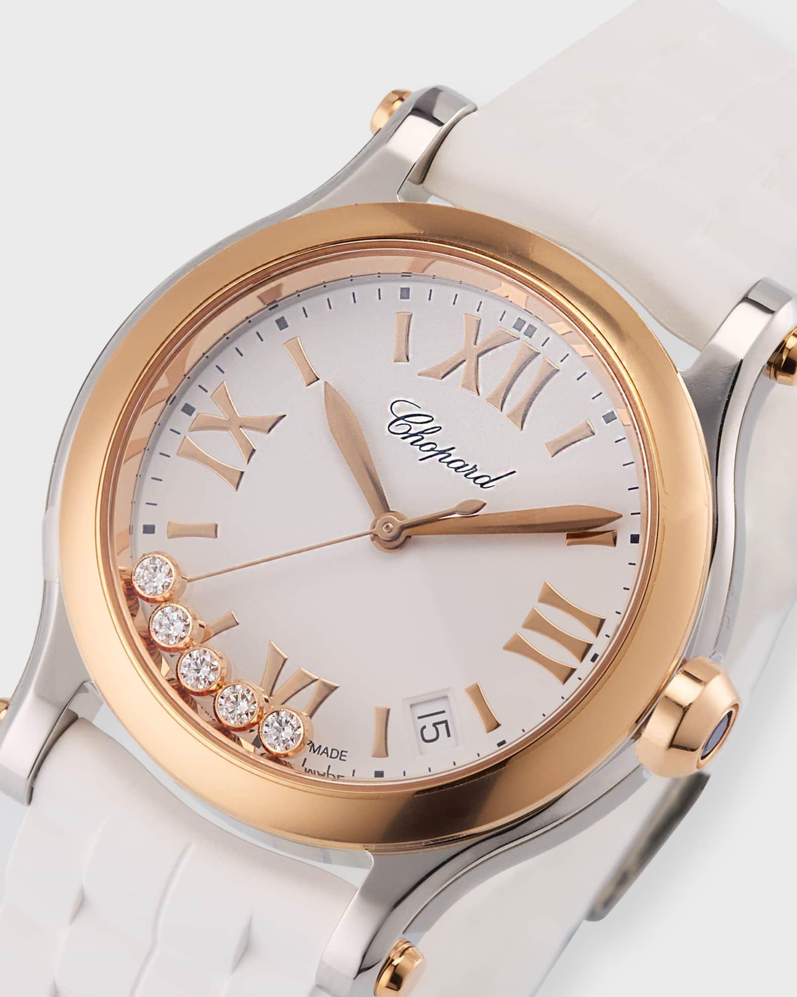 The Happy Sport collection is the emblem of Chopard’s creativity and boldness. Its playful, free-spinning gems, dancing between two sapphire crystals, have captured the imagination since 1993 when Chopard became the first Maison to combine steel and diamonds. Its watchmaking expertise has enabled Chopard to equip the Happy Sport 33 mm with a mechanical movement featuring an automatic winding mechanism specially developed for feminine cases. Little Diamonds Do Great Things. Happy Sport interchangeable watch by Chopard. Stainless steel and 18-karat rose gold hardware. Silvertone dial with batons and Roman numerals. Five free-floating round white diamond bezels. Date window at 4:30; 12 o'clock logo script. Interchangeable rubber strap with buckle. Includes both black and white rubber straps. 0.24 total diamond carat weight. Three-hand Swiss movement. Made in Switzerland. Care Instructions: Wash with a non-chemical liquid soap. Rinse piece under water, avoiding any stones. Chopard Style # 278582-6001