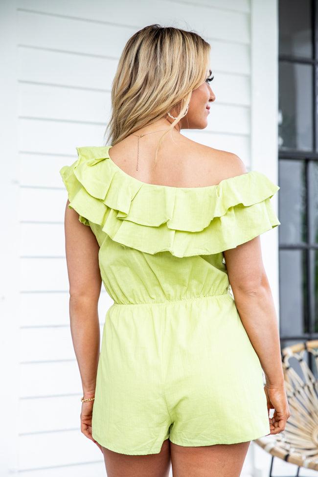 Elastic waistband, zipper closure on the side, one shoulder, ruffle trim