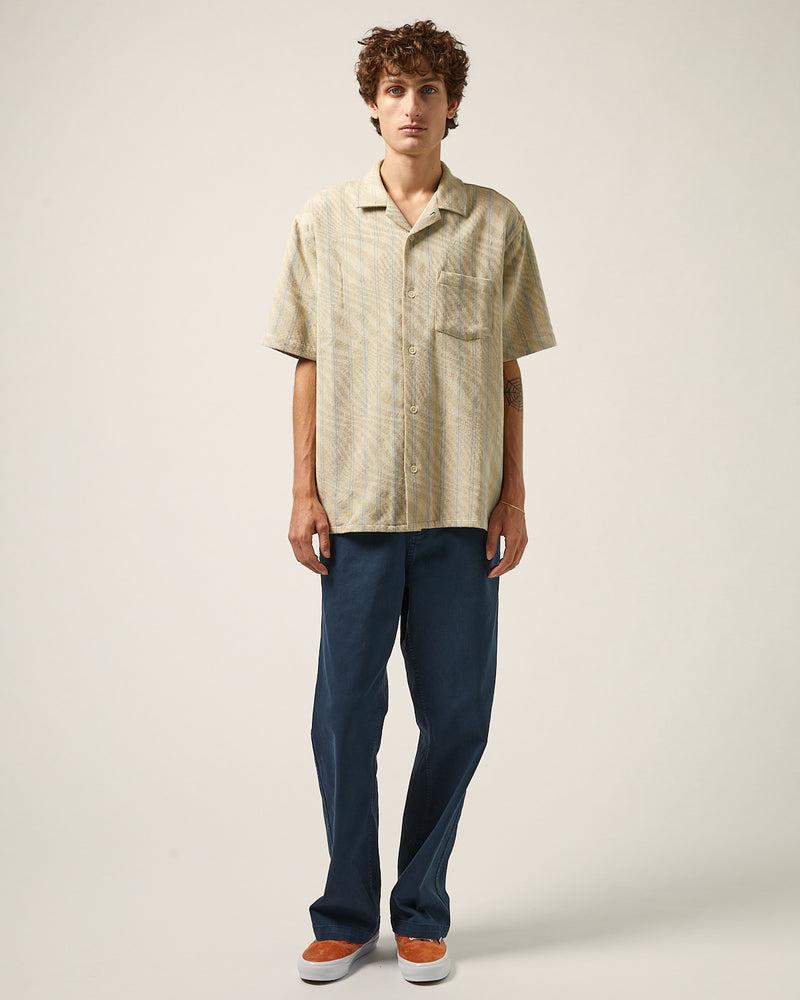 100% Cotton Intricate jacquard stripe mixed with subtle wave motif Custom designed textile Single chest pocket Camp collar Regular fit Made with care in India SS0229 Ethan is 6’1” and is wearing a size M For information on our shipping and return policies, click here.